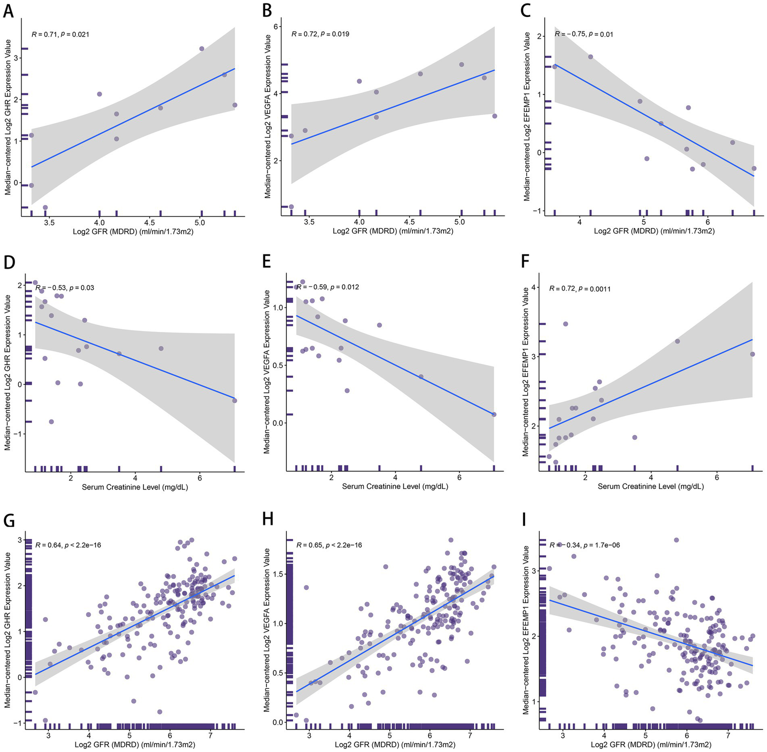 The correlation between the characteristic genes and clinical features. (A–C) Correlation plots about glomerular filtration rate (GFR) and the expression of GHR (A), VEGFA (B) and EFEMP1 (C) in DN samples. (D–F) Correlation plots about serum creatinine level and the expression of GHR (D), VEGFA (E) and EFEMP1 (F) in DN samples. (G–I) Correlation plots about GFR and the expression of GHR (G), VEGFA (H) and EFEMP1 (I) in the samples with kidney-related diseases.