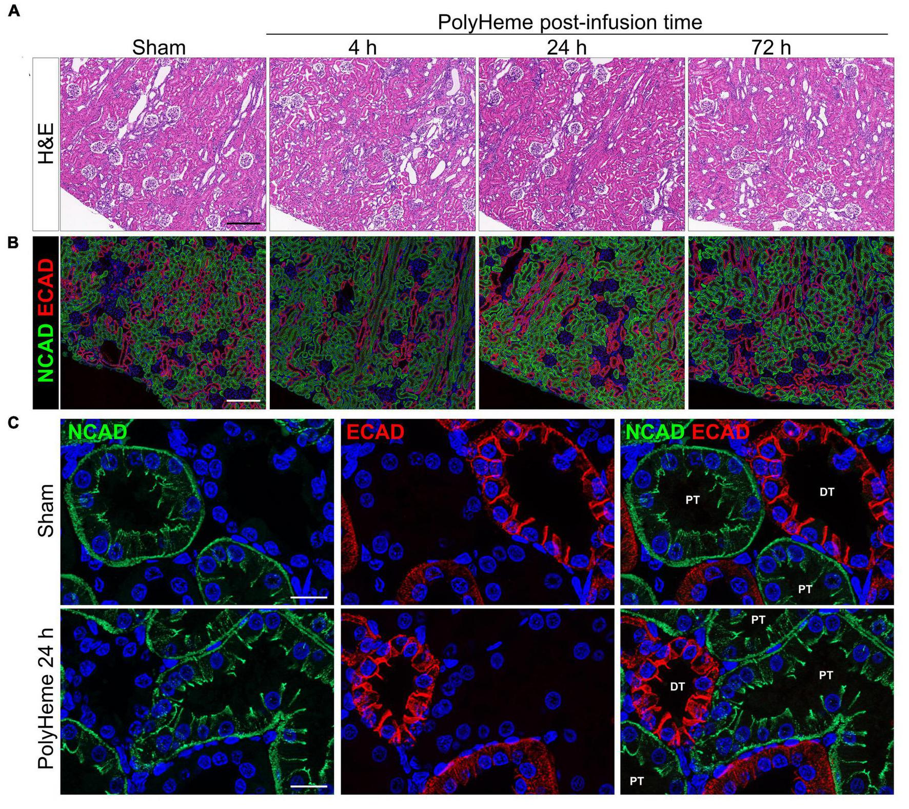 Effect of PolyHeme on epithelial junctional integrity of proximal and distal tubules. (A,B) Representative H&E and double-labeled immunofluorescence images of N-cadherin and E-cadherin in kidney sections from sham controls or PolyHeme-infused animals over the course of 72 h. (C) High resolution confocal imaging of the subcellular localization pattern of N-cadherin and E-cadherin in proximal and distal tubules, respectively. Scale bars, 250 μm (A,B); 20 μm (C). PT, proximal tubule; DT, distal tubule.