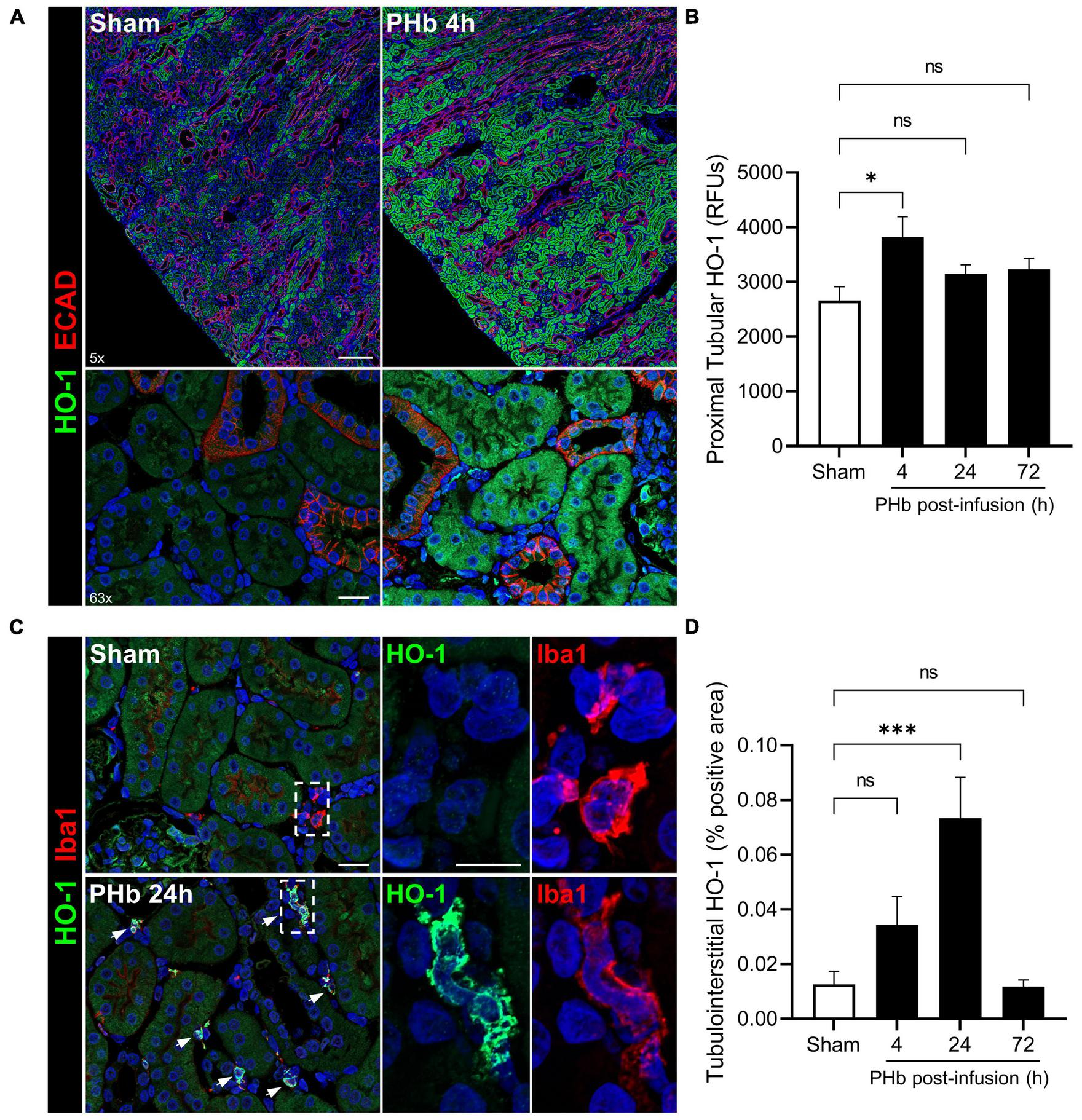 PolyHeme induces HO-1 in proximal tubular epithelium and tubulointerstitial macrophages. (A) Representative low and high magnification images of immunofluorescence staining for HO-1 and E-cadherin in cortical renal sections from sham controls or PolyHeme (PHb)-infused animals 4 h post-infusion. (B) Semiquantitative image analysis of HO-1 immunofluorescence intensity in proximal tubule segments. For each renal section, the RFU values of 40–50 randomly outlined proximal tubule profiles were measured, averaged, and the mean RFU values for each group were calculated (n = 4–5 animals per group). (C) Dual staining for HO-1 and macrophage marker Iba1 in sham controls or PHb-infused animals 24 h post-infusion. White arrows depict colocalized expression of HO-1 in Iba1-positive tubulointerstitial macrophages. (D) Semiquantitative analysis of tubulointerstitial areas positively labeled with HO-1-expressing tubulointerstitial macrophages. The mean area values for each group are shown (n = 4–5 animals per group). Scale bars, 250 μm (5× A); 20 μm (63× A); 20 μm (C). *p ≤ 0.05; ***p ≤ 0.001; ns, no statistical significance.
