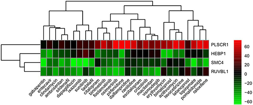 From the correlation between the summarized reverse score values and drug activity outcomes, compounds having high potency levels for psoriasis were identified. Next, reversely expressed genes by compound were predicted by a leave-one-out cross-validation procedure. Only using the inverse signals of ROR, four genes showed significantly reversed expressions (Figure 5): (i) Phospholipid Scramblase 1 (PLSCR1), (ii) Structural Maintenance Of Chromosomes 4 (SMC4), (iii) Heme Binding Protein 1 (HEBP1), and (iv) RuvB Like AAA ATPase 1 (RUVBL1). The drugs against psoriasis identified here were the endothelin receptor antagonist, ambrisentan and macitentan; the prostaglandin analogs, bimatoprost and latanoprost; the immunosuppressants, pirfenidone and pomalidomide; the macrolide antibiotics, azithromycin and erythromycin; and the antineoplastic agents, binimetinib, crizotinib, ixazomib, osimertinib, sunitinib, and vismodegib.