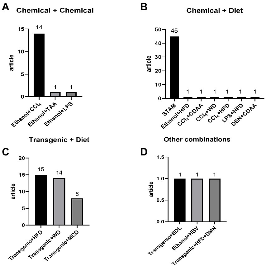 Figure 2. Detailed distribution of combine induction methods: (A) chemical + chemical: ethanol + CCl4 14, ethanol + TAA 1, ethanol + LPS 1; (B) chemical + diet: STAM 45, ethanol + HFD 1, CCl4 + CDAA 1, CCl4 + WD 1, CCl4 + HFD 1, LPS + HFD 1, DEN + CDAA 1; (C) transgenic + diet: transgenic + HFD 15, transgenic + WD 14, transgenic + MCD 8; (D) other combinations: transgenic + BDL 1, ethanol + HBV, transgenic + HFD + DMN 1.