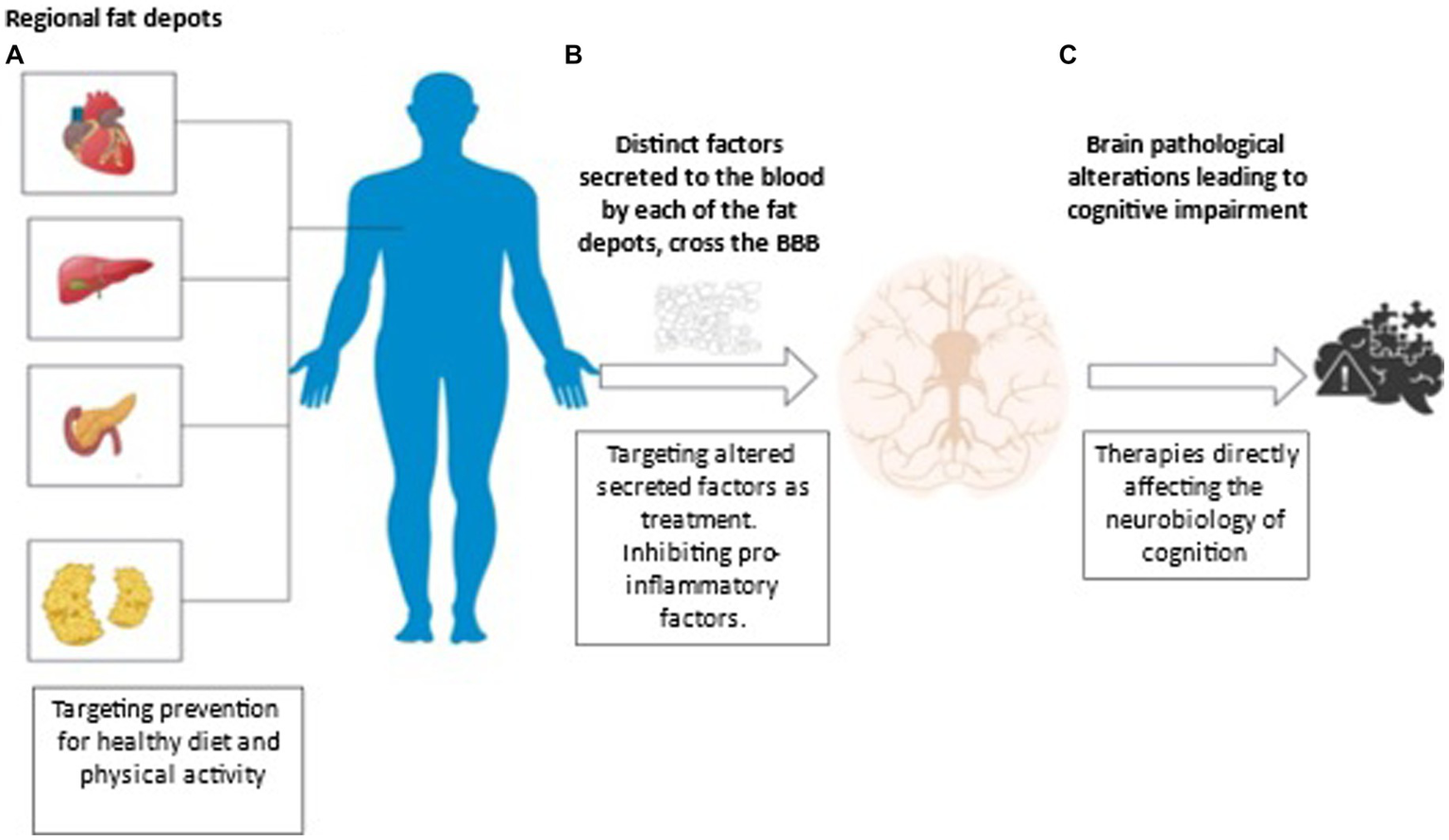 Indeed, different fat depots release different secreted factors, some of which cross readily the blood brain barrier (BBB) and may cause damage, ultimately leading to cognitive decline (56, 63, 66). For example, pro-inflammatory factors such as leptin, IL-6, TNF-α (105, 106) which are secreted by adipocytes can cross the BBB and lead to neuroinflammation, which plays a role in cognitive impairment and AD (107). Conversely, anti-inflammatory adipocytokines such as Adiponectin (108), Interleukin 10 (IL-10) (109, 110), and Apelin (111), are associated with less adiposity and are related to cognition and AD. Neuroinflammation likely causes synaptic remodeling and neurodegeneration resulting in disruption of cognitive functioning possibly resulting from damage brain regions subserving cognition such as the hippocampus (112). Targeting these factors could be an efficacious way to prevent or delay later cognitive decline and AD.
