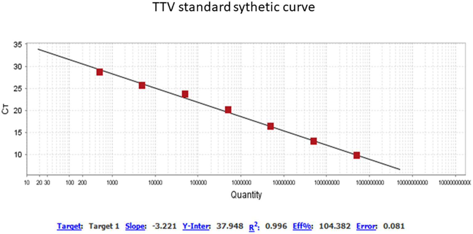 A thawed AF aliquot from each subject was submitted to DNA extraction using the EasyMag automatized extractor (NucliSENS® easyMag® bioMérieux, Durham, NC), according to the manufacturer’s instructions. All samples were suitable for DNA analysis, i.e., they did not contain inhibitors of DNA amplification, as judged by successful amplification of an internal control (human fragment genic RNAse P) using primers and a probe described previously (17). TTV-specific DNA was amplified using a target to a segment of the untranslated region (UTR) of the viral genome using primers and a probe as previously described by Maggi et al. (18): forward primer 5′-GTGCCGIAGGTGAGTTTA-3′; reverse primer 5′-AGCCCGG CCAGTCC-3′; probe 5′-FAM TCAAGGGGCAATTCGGGCT-MGBNFG 3′. The real time quantitative PCR (qPCR) was performed with 0.25 μM of each primer, 0.062 μM of probe and ~100 ng de DNA template in final volume of 25 μL in TaqMan® Universal Master mix (Thermo Fisher Scientific, Warrington, United Kingdom) according to the manufacturer’s instructions. Thermocycling conditions consisted of two initial heat activation steps of 50°C for 2 min and 95°C for 15 s, followed by 50 cycles of 15 s at 95°C and 1 min at 60°C, in a Quantstudio™ 5 instrument. For TTV quantification, the TTV qPCR standard curve was generated using known amounts of HPLC purified synthetic DNA of 73 bp, commercially synthesized (Exxtend Biotecnology Ltda, São Paulo, Brazil): 5′-TTCGTAGCCCGGCCAGTC CCGTATAGCCCGAATTGCCCCTTGAATGCGTTAAACTCACC AI CGGCACCTGATA-3′ as previously described (5). The lyophilized synthetic DNA was diluted in T.E buffer (10 mM Tris, 0.1 mM EDTA, pH 8.0) at initial concentration of 100 pmol/μL, which is approximately 1013 DNA molecules/μL, according to Avogadro’s number calculation, and 10-fold serially diluted in nuclease-free water for generating the standard curve, according to the protocols previously described (5, 19). The data were analyzed using QuantStudio Design & Analysis Software v.1.4.1. The analytical sensitivity of TTV qPCR was 40 copies/mL (1.6 log10 copies/mL) at ≥95% detection rate. The curve is presented in Figure 1. The qPCR efficiency was of 104.4% (R2 = 0.99 and slope = −3.22). The parameters of the test quality were based on guidelines previously described (20).