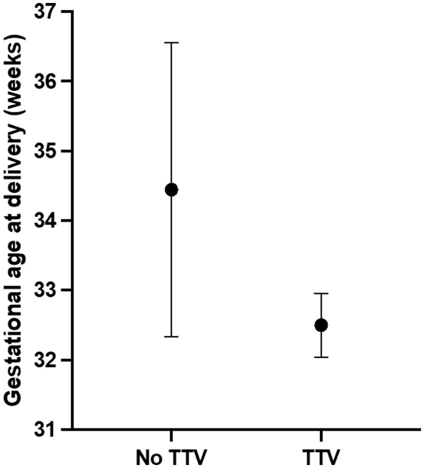 Gestational age at delivery in pregnancies positive or negative for TTV in amniotic fluid. TTV in amniotic fluid was detected by gene amplification. Pregnancy outcome was subsequently obtained by chart review. Values are expressed as mean and 95% confidence intervals. The dot indicates the mean value.