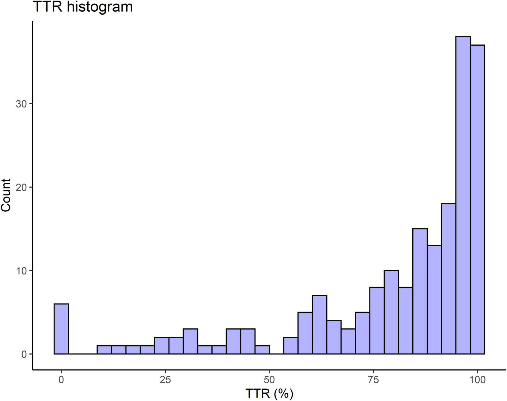 | TTR (%) | 82.1 ± 22.2 | 94.2 ± 7.9 | 69.0 ± 29.6 | 79.7 ± 25.0 |