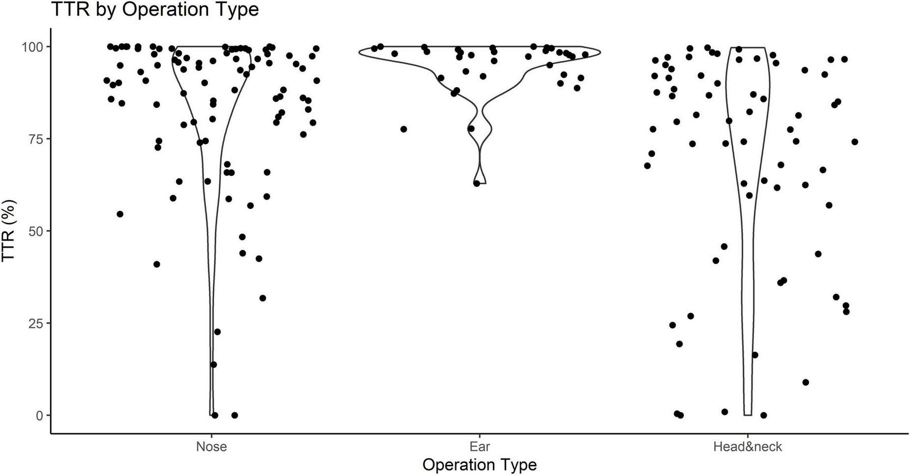 Time in therapeutic range (TTR) according to the surgical site classification of otorhinolaryngologic surgery. TTR represents the percentage of time in which the cuff pressure remains in the appropriate range against the total anesthesia time.
