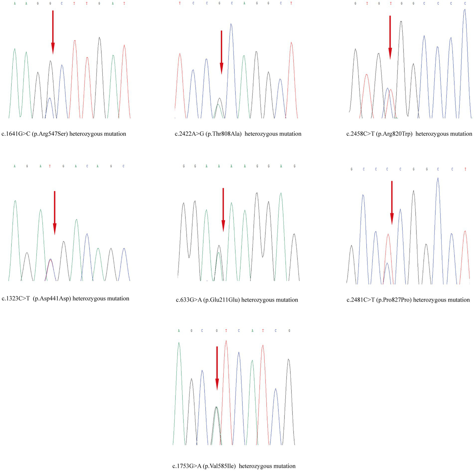 Skin tissue biopsy showed histopathological changes in the skin, where the epidermis showed mild vacuolar degeneration and varying numbers of neutrophil infiltrates just beneath the surface of the deep dermis—primarily the superficial dermis—as well as cavernous pustules under the epidermis; an example of these changes is presented in Figure 2. We performed whole exome sequencing and Sanger validation on all five patients and identified CARD14 gene mutations in three patients. Seven mutation sites were detected: c.1641G > C (p.Arg547Ser) heterozygous mutation, c.2422A > G (p.Thr808Ala) heterozygous/homozygous mutation, c.2458C > T (p.Arg820Trp) heterozygous mutation, c.1323C > T (p.Asp441Asp) heterozygous mutation, c.633G > A (p.Glu211Glu) heterozygous mutation, c.1753G > A (p.Val585Ile) heterozygous mutation, and c.2481C > T (p.Pro827Pro) heterozygous mutation (Figure 3). No mutations were identified in the IL-36RN gene.