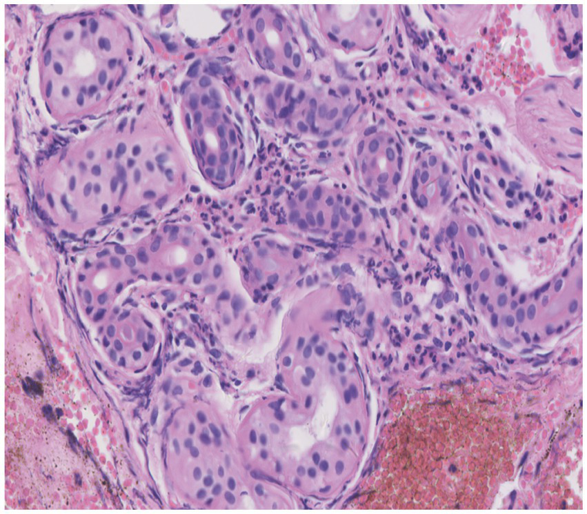Histopathological examination of a skin biopsy from the left chest showed mild vacuolar degeneration of epidermal basal cells, varying numbers of neutrophil infiltrates in the superficial-deep dermis (mainly in the superficial dermis), and epidermal cavernous pustule formation (hematoxylin and eosin staining; original magnification, ×400).