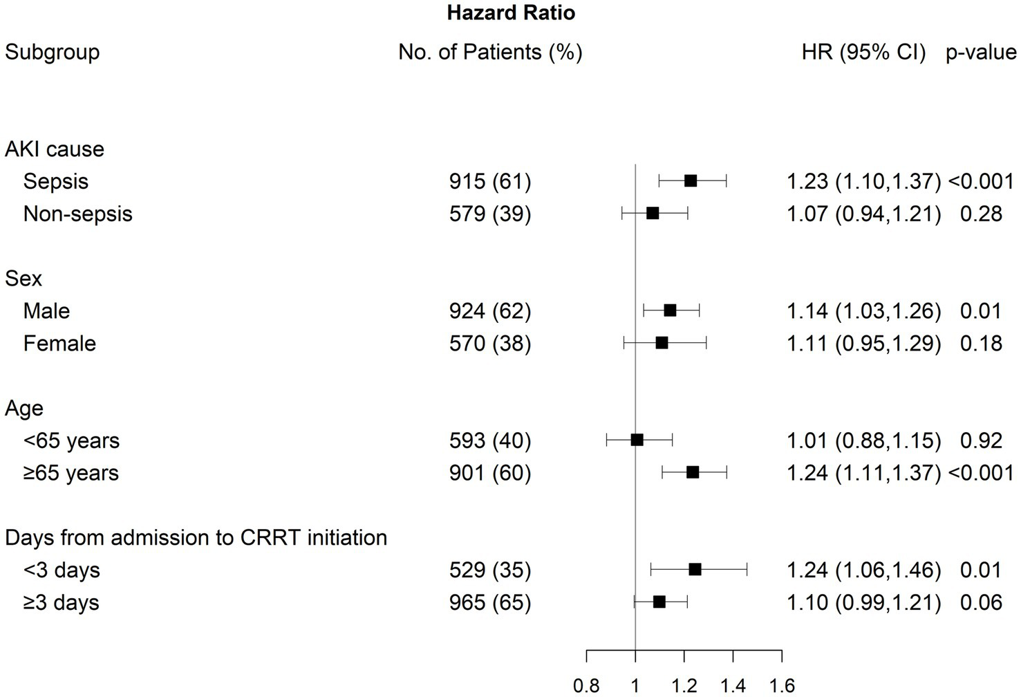 We conducted subgroup analyses by stratifying patients according to AKI cause, sex, age, and the number of days from CRRT initiation (Figure 4). The association between NLR fold change on day 5 and 30-day mortality was statistically significant, particularly in individuals with septic-AKI, male sex, age ≥65 years, and duration between admission and CRRT initiation <3 days. However, no significant modifying effect was identified, except for age (p for interaction = 0.04).