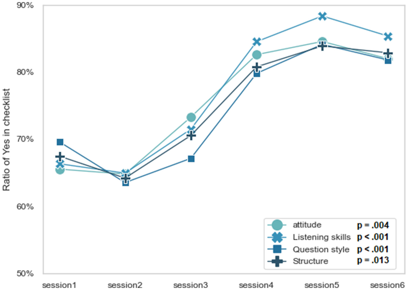 Ratio of “yes” ratings on the student–doctors' peer-rated competence checklists across six sessions. The Friedman test was conducted for each dependent variable, with significant results found for attitude [ = 17.11, p = 0.004], listening skills [ = 33.02, p < 0.001], question style [ = 21.95, p < 0.001], and structure [ = 14.45, p = 0.013].