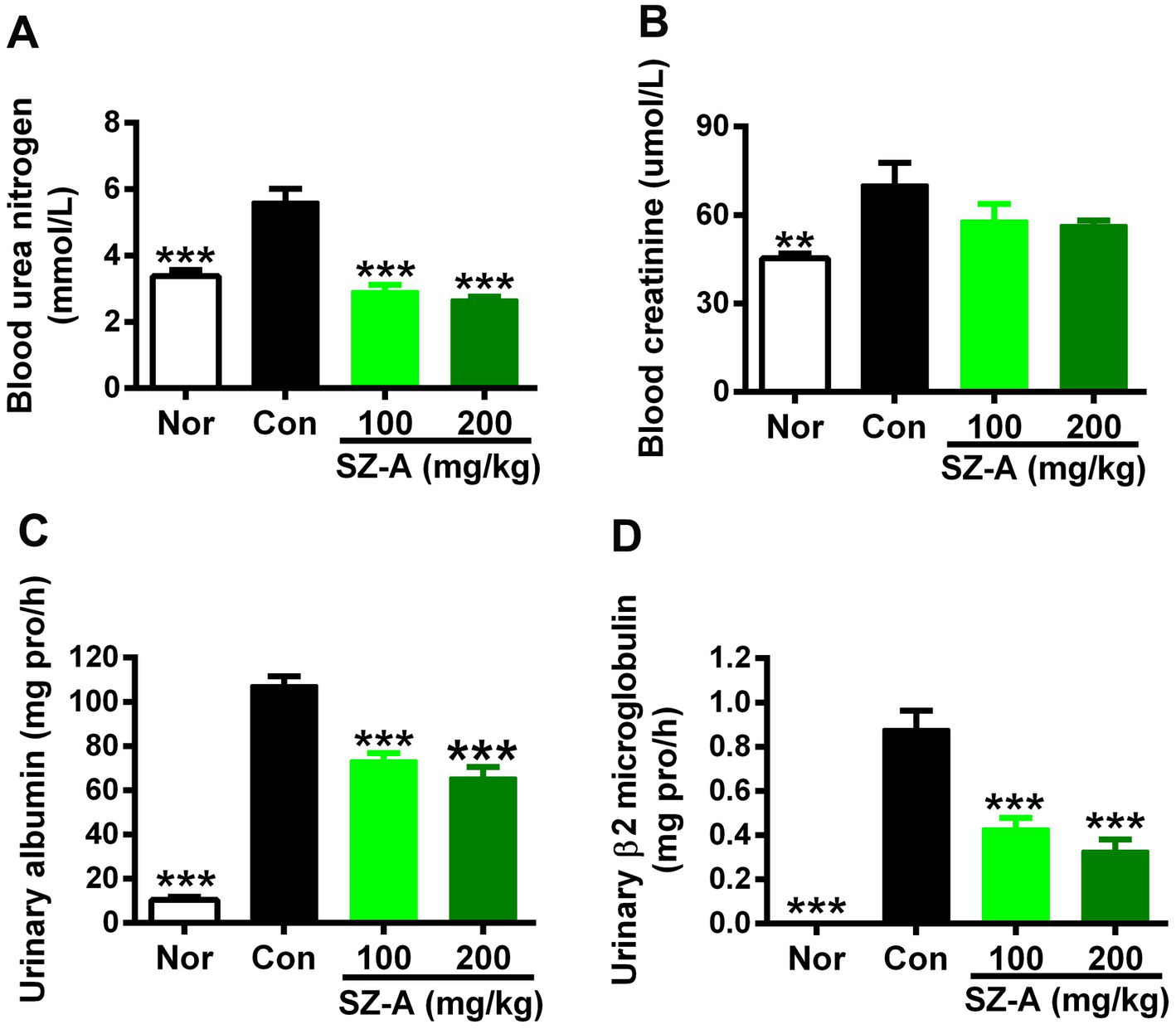 In comparison with the Con group, SZ-A treatment reduced the blood urea nitrogen level in a dose-dependent manner (p < 0.001, Figure 2A), and lowered the blood creatinine level by 17.3 and 19.5% at 100 mg/kg and 200 mg/kg doses, respectively (p > 0.05, Figure 2B). Furthermore, repeated treatments with SZ-A significantly and dose-dependently decreased the levels of albumin and β2-microglobulin in the urine (p < 0.001, Figures 2C,D).