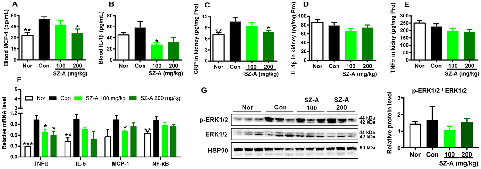 Repeated treatment with SZ-A significantly improved glucose metabolism, dose-dependently decreased the levels of blood urea nitrogen, urinary albumin, and β2-microglobulin, and evidently relieved the renal injury in diabetic ZDF rats. As for the mechanisms, SZ-A remarkably ameliorated systemic nitrosative stress through lowering the levels of blood inducible nitric oxide synthase and nitric oxide, and significantly relieved systemic and renal inflammation by reducing the levels of blood interleukin-1β and monocyte chemoattractant protein-1 (MCP-1) and decreasing the levels of renal C-reactive protein content and expression of tumor necrosis factor-α in the kidneys. SZ-A also improved renal fibrosis by lowering the expression of TGFβ1 in the kidneys. Additionally, SZ-A significantly lowered the expression of stimulator of chondrogenesis 1 in the kidneys.