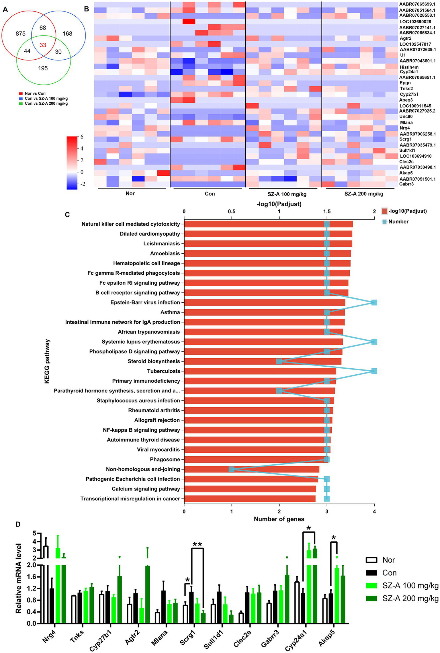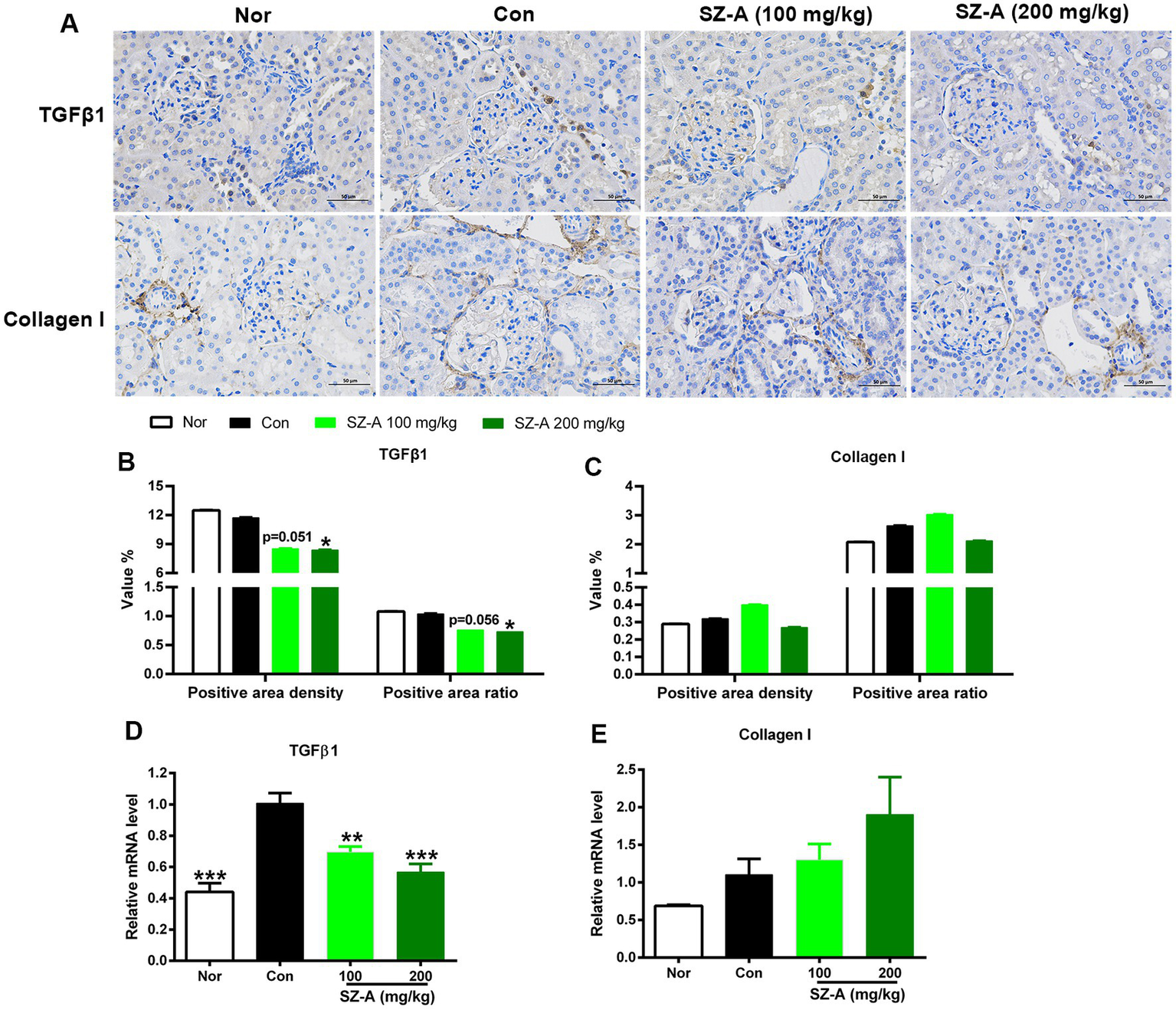 Diabetic ZDF rats were orally administered 100 and 200 mg/kg of SZ-A once daily for 9 weeks. The glucose metabolism and kidney function were assayed. The pathological injury and fibrosis of the kidneys were separately evaluated using hematoxylin and eosin staining and Masson’s staining. The oxidative and nitrosative stress and inflammation were assayed by determining the levels of related indices in the blood and kidneys and quantifying the related gene and protein expression. The expression of transforming growth factor β1 (TGFβ1) gene and protein were assayed by quantitative real-time PCR and immunohistochemistry, respectively. The renal transcriptomics was analyzed using RNA sequencing.