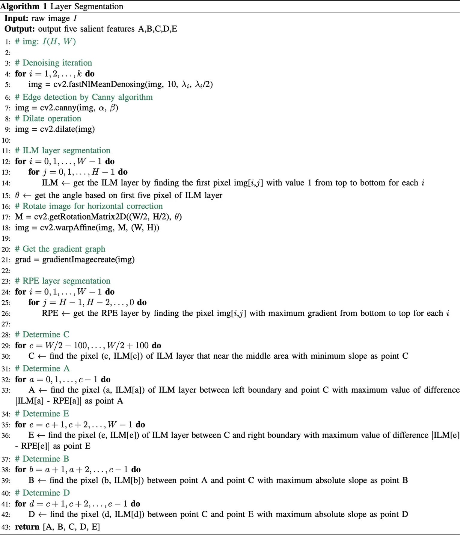 To fully obtain the information from OCT images, morphological features of the macula were extracted and analyzed. The process of image analysis is presented in Figure 1. Firstly, irrelevant signal-to-noise was reduced by the denoising algorithm. The pixels were smoothly connected using the dilate algorithm, and the edges were detected to obtain the layered boundaries. The internal limiting membrane (ILM) layer was probed from top to bottom (Step 1). A horizontal correction was then performed based on the curve of the ILM layer to obtain a profile of the total retinal thickness (Step 2). Similarly, by creating a gradient graph to filter out the hazy features next to the retinal pigment epithelium (RPE) and highlight the RPE layer, the boundary of the retinal pigment epithelial cell layer was probed (Step 3). Five marks of the fovea were automatically recognized (Step 4). There was no slope in the temporal and nasal rims of the fovea in the horizontal meridian (Figures 1A,E). The pseudocode of this pre-processing process is in Algorithm 1. Additionally, the pit of the fovea (Figure 1C) had no slope. A maximum slope for the temporal and nasal foveal walls of the horizontal meridian was also detected (Figures 1B,D). Five salient features of the foveal pit were extracted from these five marks, including foveal thickness, pit depth, diameter, maximum thickness, and foveal slope (16, 17).