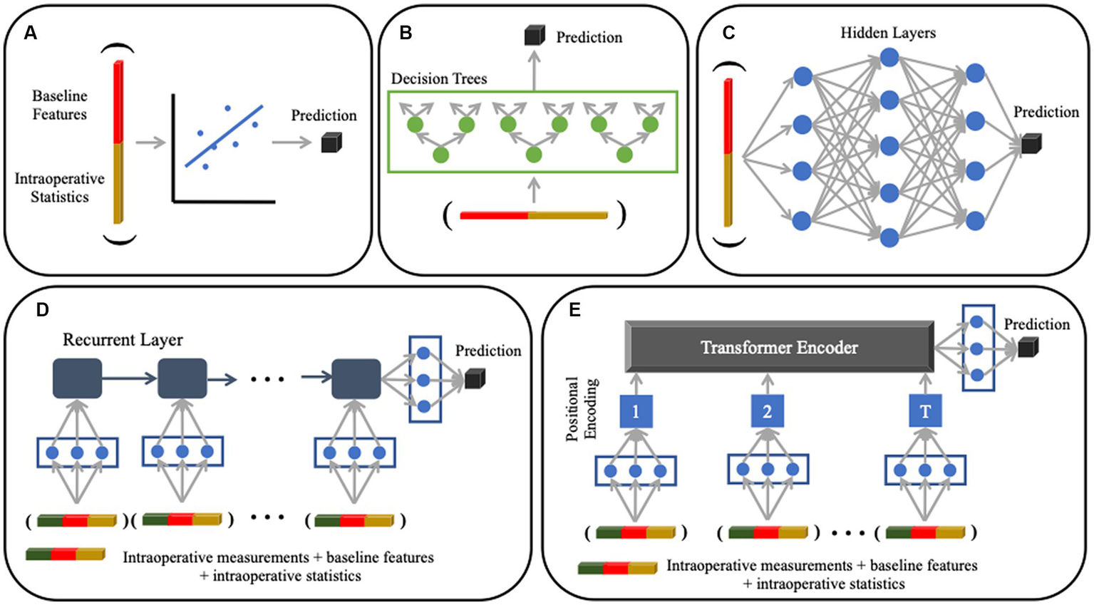 Machine learning models used for analysis. (A) Multivariate linear regression with an ElasticNet penalty (not pictured) to encourage feature sparsity. (B) Random Forest regression that uses an ensemble of decision tree classifiers for prediction; each tree is grown by iteratively searching for the feature that splits the patients into clusters with the lowest pairwise difference of lactate values within each cluster. (C) Artificial Neural Network that uses a sequence of fully connected layers to project the data onto latent representations (denoted by blue dots). The models in Panels (A–C) use static baseline and intraoperative variables as input variables. (D) Recurrent Neural Network that handles dynamic sequences through a series of feedback operations; this model can accommodate different input sequence lengths. (E) Transformer that uses a self-attention mechanism to model both short-and long-range dependencies in the input sequence. The models in (D) and (E) use time series intraoperative data, as well as static baseline and intraoperative variables, as input variables.