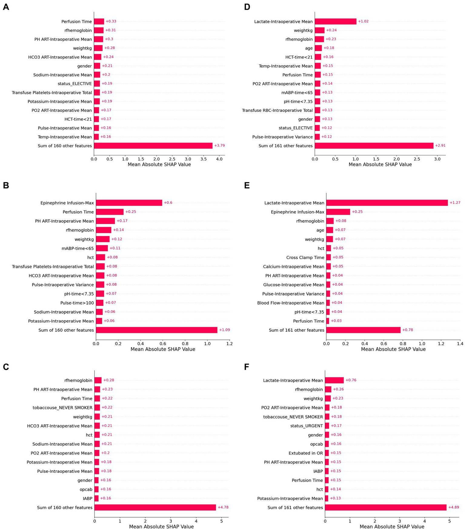 SHAP values for six model configurations to predict lactate concentration after cardiac surgery. Shapley additive values (SHAP values) represent an estimate of the contribution of each feature to the model prediction, with higher mean values indicating greater feature performance. The highest SHAP values are shown for linear regression (A,D), random forest (B,E), and artificial neural network models (C,F). Panels (A–C) use baseline and intraoperative variables (but not intraoperative lactate) as inputs, while Panels (D–F) also include intraoperative lactate values as inputs.