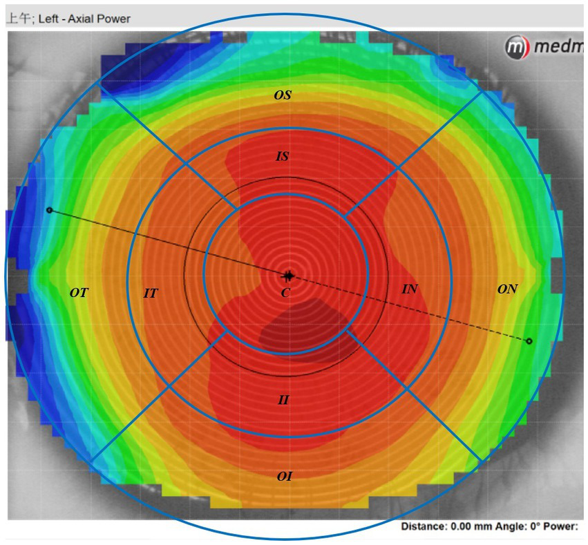 The Medmont E300 (Medmont International Pty. Ltd., Victoria, Australia) with the software of Medmont Studio 6 was used in this study. Each eye was imaged four times at each visit, and a score of >95% was recorded for statistical analysis. The axial corneal refractive power was automatically measured with chord lengths of approximately 11 mm. The corneal topography raw data within a radius of 5.5 mm including 32 rings were exported directly from the instrument, and then imported into the customized MATLAB software. The corneal axial keratometry raw data were used to reconstruct the cornea topography map, which was divided into 3 zones and 9 sectors. The radius of center zone was up to 1.67 mm including 10 rings, the inner zone was from the 1.67–3.3 mm apart from the apex including 11–20 rings, and the outer zone was from the 3.3–5.5 mm including 21–32 rings. Both of the inner and outer zones were divided into four sectors include superior, inferior, nasal and temple sectors. The sectors were named as center (C), inner inferior (II), inner superior (IS), inner temple (IT), inner nasal (IN), outer inferior (OI), outer superior (OS), outer temple (OT), outer nasal (ON). The detail of the corneal sectors is shown in the Figure 1. The detail of the data procession is found in previous literature (23, 24). In the research of Lee et al. (25), used the index of apex-periphery refractive power difference (ARPD) describe the corneal changes after wearing orthokeratology lenses. While Jiang et al., used the relative corneal refractive power shift (RCRPS) (22, 26, 27). In this study, we used RCRPS, which was defined as follows: compared with the baseline corneal topography, the posttreatment corneal topography, was used to acquire a difference map, and using the data of the difference map, the RCRPS was calculated by subtracting the central refractive power. The specific procedure of how to acquire the RCRPS is shown in the Figure 2.