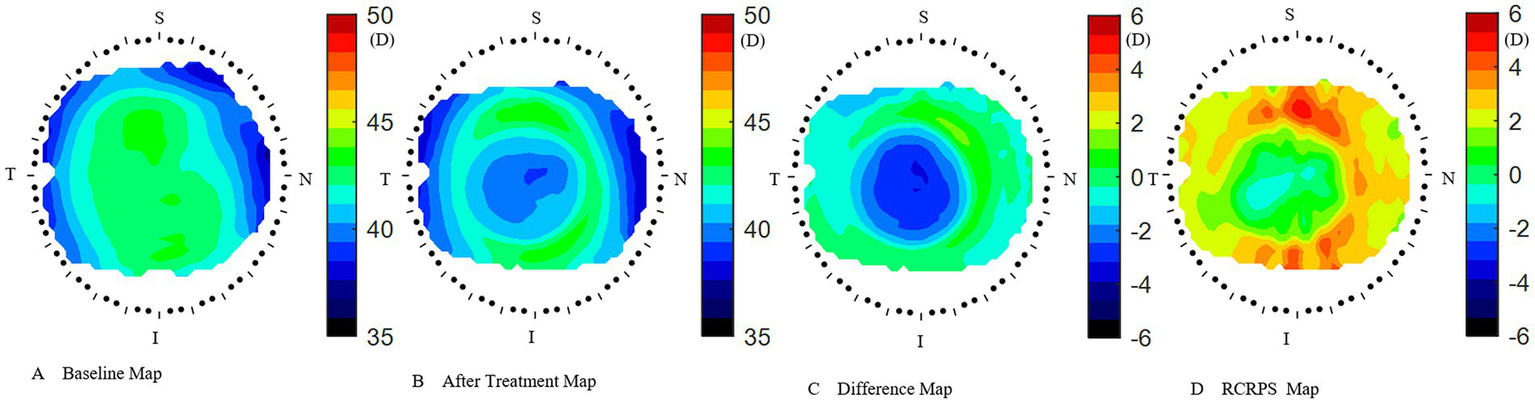 The RCRPS was reported by Wang et al. to describe the change of corneal power. In their reports, myopic control appears to be related to a larger RCRP modulation, specific 4.5D (22).The RCRPS related to the myopia progression in the report of Zhong et al., in which, the data were collected manually at 1 mm, 2 mm, 3 mm, and 4 mm away from the apex along the nasal, temporal, and inferior axes respectively, In the research by Jiang et al., based on the RCRPS, they described a new index of “Halfx” to quantify the RCRPS (27). All these researches, showed positive RCRPS, similar to our observations, although the instruments or the methods of RCRPS calculation were not exactly the same as those in our research.