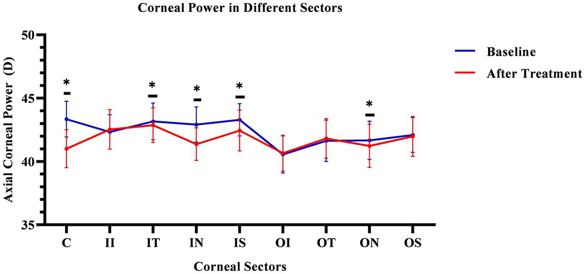 Comparing cornea Axial refractive powers in different sectors before and after OK lens wearing. The corneal refractive powers of the central zone (C) and peripheral central zones (IT, IN, IS, and ON) were significantly decreased after 3-month of wearing an orthokeratology lens (p < 0.05). The blue line represents the baseline data. The red line represents the data after treatment. The * mean the significant different between baseline and 3 months OK lens wearing. C, center; II, inner inferior; IT, inner temple; IN, inner nasal; IS, inner superior; OI, outer inferior; OT, outer temple; ON, outer nasal; OS, outer superior. The *means the significant different between the data of baseline and that of 3 months after OK lens wear.