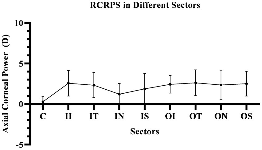 In this study, the RCRPS were all positive at all sectors, which mean that relative to the central area of the cornea, the diopter is larger, and its ability to converge light is stronger, that is, the relative myopic defocus state in cornea.