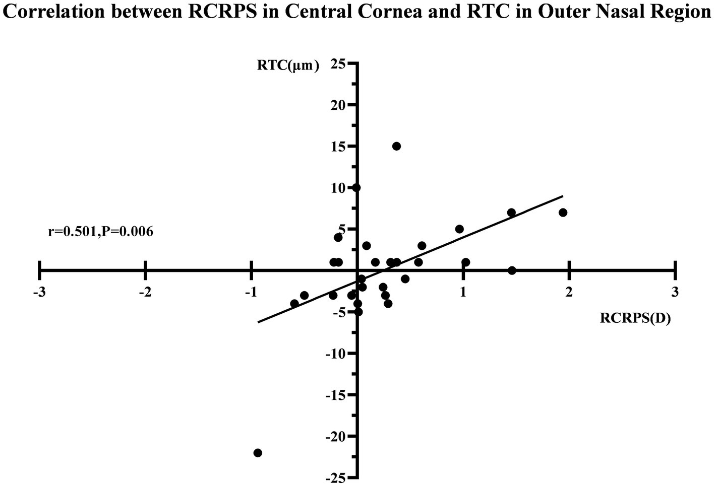 The correlation between RCRPS and RTC. The r was 0.501 and the p value was 0.006. RTC, retina thickness change; RCRPS, relative corneal refractive power shift.