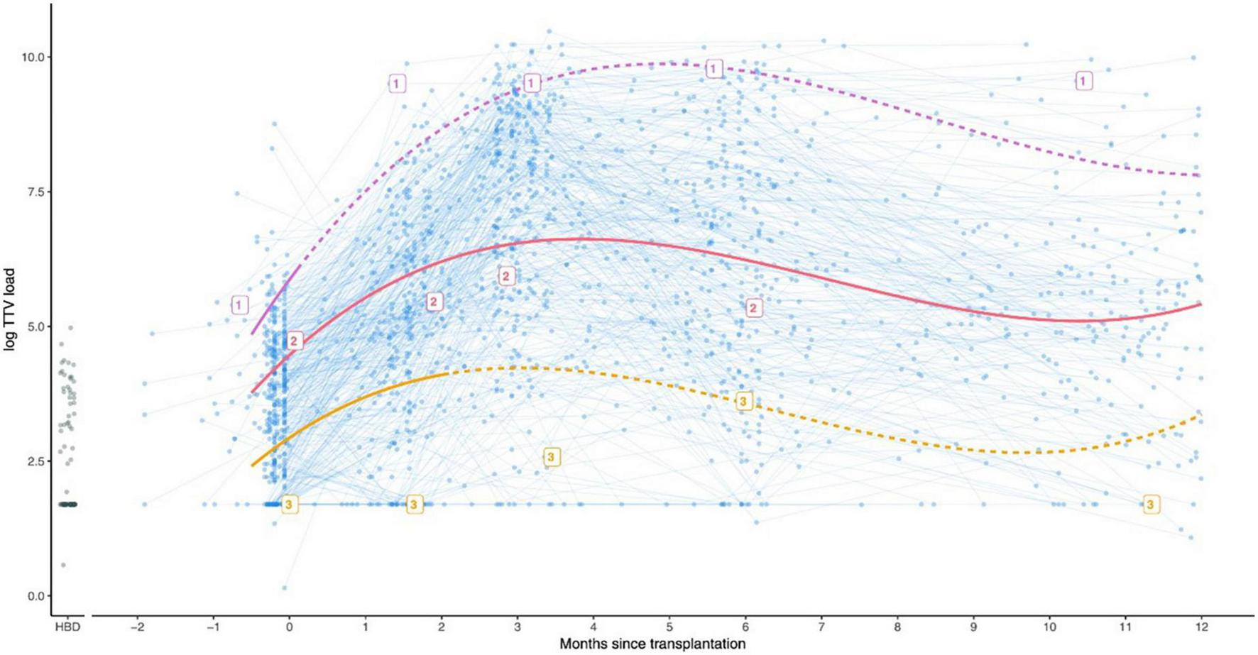 Graph showing the observed TTV loads for kidney transplant recipients (blue), and a group of 88 healthy blood donors for comparison (HBD, shown in black circles). In addition, three example patients indicated with the labels 1, 2, and 3 are shown. Patient 1 (purple) developed rejection 5 days after transplantation and was treated accordingly with a course of strong immunosuppressants. Patient 2 (pink) did not develop rejection. Patient 3 (orange) developed rejection 64 days after transplantation. Used with permission (39).
