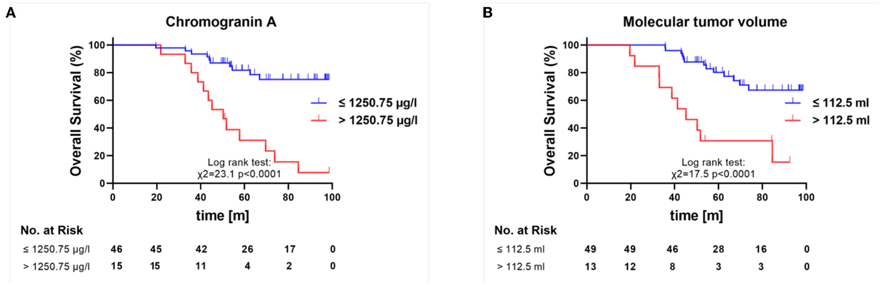According to interim PET/CT, 16 patients (25.8%) presented with partial response (PR), 38 (61.2%) with stable disease (SD), and 7 (11.3%) with progressive disease (PD). The 5-year OS was 61.8% for all patients, while bronchopulmonary NETs showed poorer OS than GEP-NETs. Multivariable Cox regression analysis showed that chromogranin A level and MTV together were highly significant predictors of therapeutic outcome (HR 2.67; 95% CI 1.41–4.91; p = 0.002). Treatment response was also influenced by the LDH level (HR 0.98; 95% CI 0.9–1.0; p = 0.007) and patient age (HR 1.15; 95% CI 1.08–1.23; p < 0.001). ROC analysis revealed baseline MTV > 112.5 ml [Sens. 91%; Spec. 50%; AUC 0.67 (95% CI 0.51–0.84, p = 0.043)] and chromogranin A >1,250.75 μg/l [Sens. 87%; Spec. 56%; AUC 0.73 (95% CI 0.57–0.88, p = 0.009)] as the best cutoff values for identifying patients with worse 5-year survival.