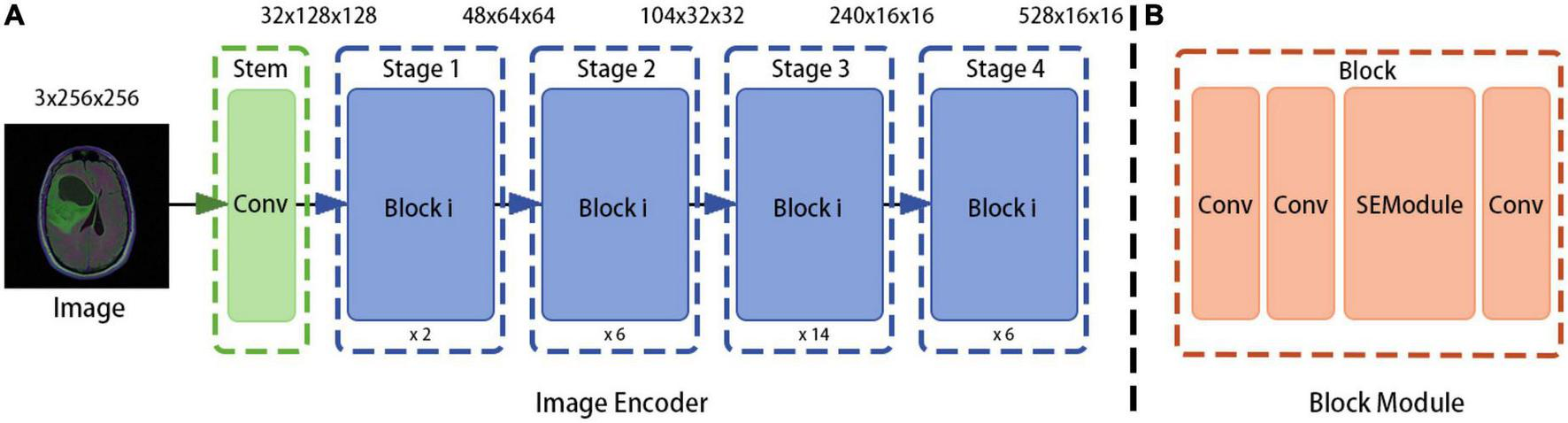 RegNet (regnetz_040) model architecture. (A) The image encoder consists of a stem and a body. (B) The network body is composed of a series of blocks, which contain convolution modules and Squeeze-and-Excitation (SE) channel attention modules, aimed at evaluating the importance of channel dimensions and more efficiently extracting features (9).