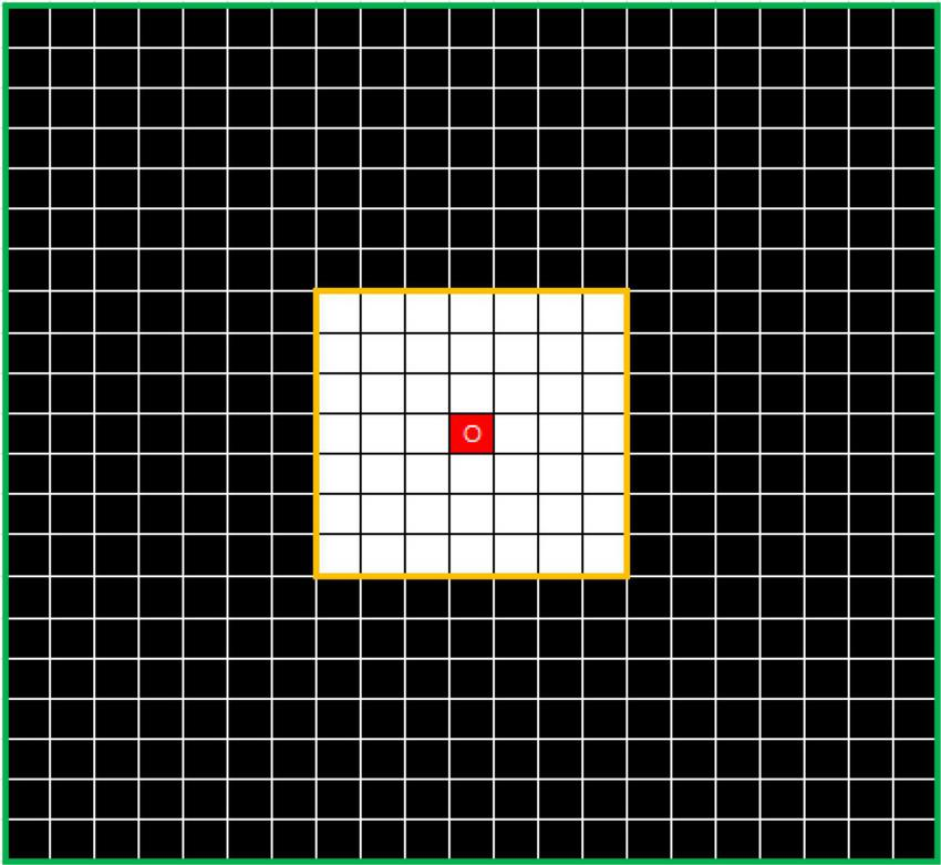 Example showing N7 and N21 neighborhoods centered on O. The value of DensityWhite(O) is the ratio of the number of white dots to the number of black dots.
