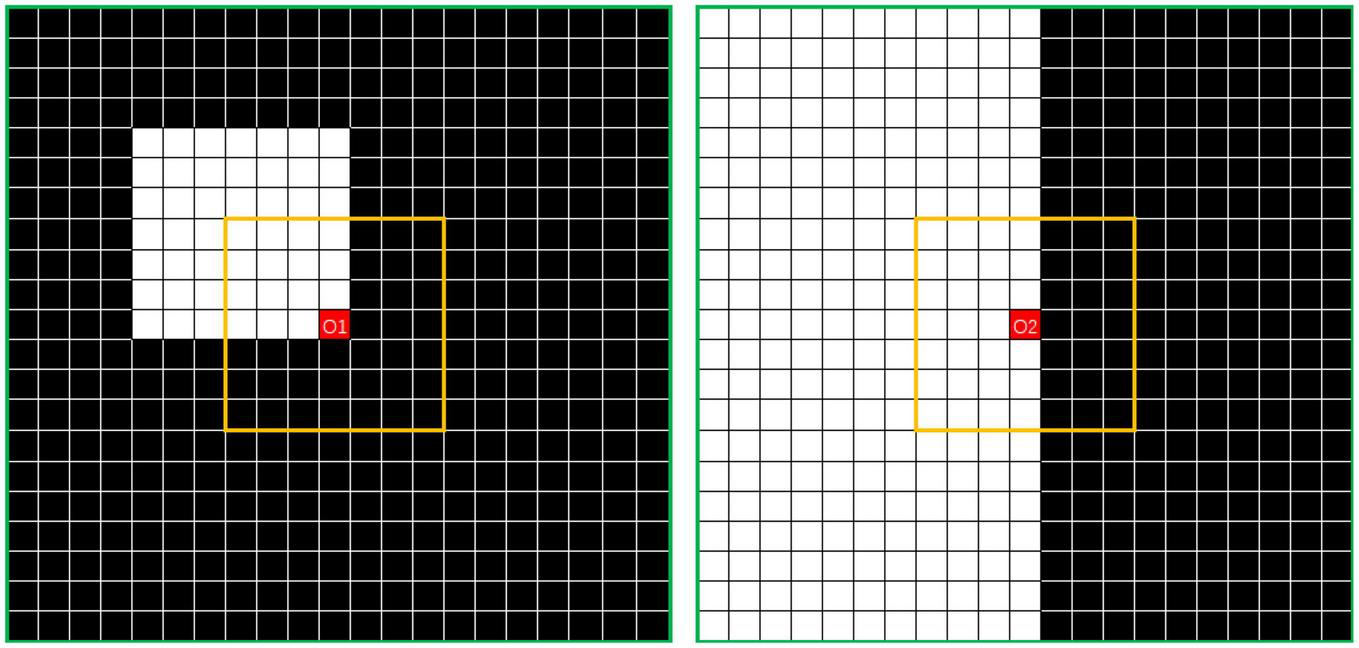 The density characteristics of the corner area of the noise and those of the edge area of the segmented object should be distinguished. In Figure 5, where i is 7 and j is 21, the points O1 in the left image and O2 in the right image represent the pixel at the corner of the noise area and the pixel point at the edge area of the segmented object, respectively. In this study, the simplest method of excluding the edge area from the density calculation was adopted. Thus, the threshold is calculated according to the number of points of the same color in the interval area, which is exactly the number of white points between the yellow and green lines. The left image can be regarded as the boundary case of point O1. If the value exceeds the threshold, the operation is set to 0. The threshold can be calculated using the following formula: