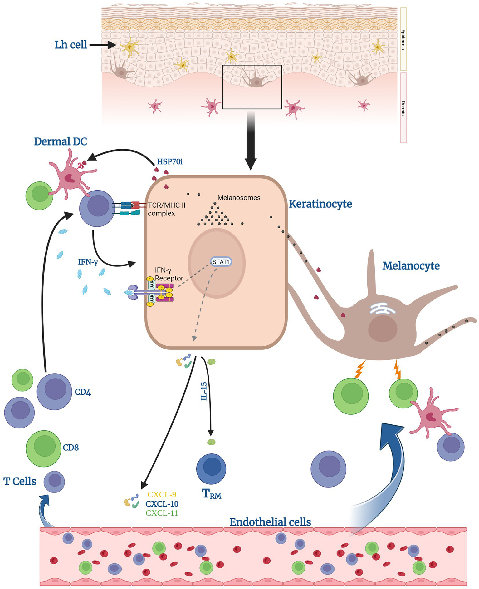 Keratinocytes can help induce anti-melanocyte immune responses. Keratinocytes can activate dermal dendritic cells (DCs) and CD4 T cells by presenting processed melanosomal antigens in the context of MHC II, supported by surrounding HSP70. Activated CD4 T cells secrete IFN-γ. Upon receptor binding, this leads to signal transducer and activator of transcription (STAT1) phosphorylation by Janus Kinases (JAKs) and release of CXCL chemokines 9–11 and of IL-15. Said chemokines help recruit T cells to eradicate melanocytes. IL-15 specifically supports the generation of tissue-resident memory T cells (TRM) within the lesional skin.