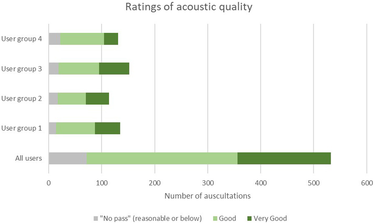 The mean rating of the acoustic quality of auscultations with the SC by all users was 4.2 ± 0.7 (Median 4.0; range 2–5) on a 5-point Likert scale (Table 3). A total of 86.1% of all auscultations with the SC were rated at least” good” (score of 4 or higher) with comparable results across user groups ranging from 88.3% for fully trained physicians (group 1), 85.1% for physicians in speciality training (group 2), 87.5% for nurses with 10 or more years of professional experience (group 3), and 83.1% for nurses with less than of professional experience (group 4), respectively (Table 3; Figure 3). No auscultation was rated as “poor” (score of 1). For two out of 534 auscultations no rating was recorded.