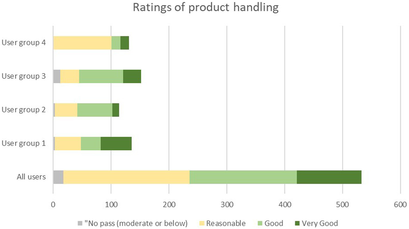 | User group | Ratings of handling (% and n) | ||||