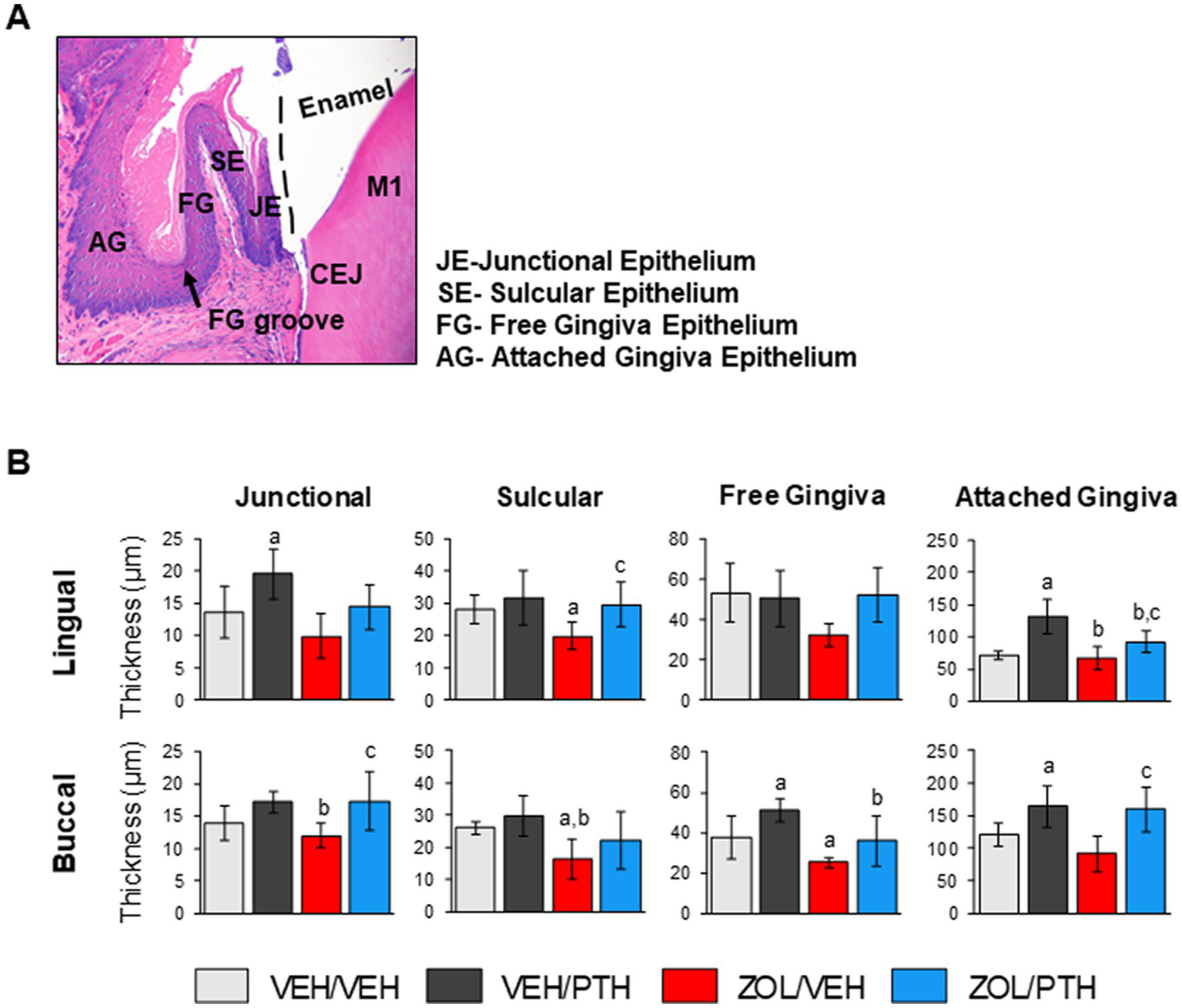 Effects of ZOL and iPTH on the gingival epithelial thickness of the mandible. (A) Representative photomicrograph of an H&E-stained section of the gingival epithelium in the mandible at the lingual side of the M1 region. (B) Gingival epithelial thickness was evaluated at four different regions, including the junctional, sulcular, free gingiva and attached gingival epithelium at the lingual and buccal surfaces. Bars represent mean ± SD. Superscripts a–c denote significant differences from VEH/VEH, VEH/PTH and ZOL/VEH rice rats, respectively (p < 0.05).