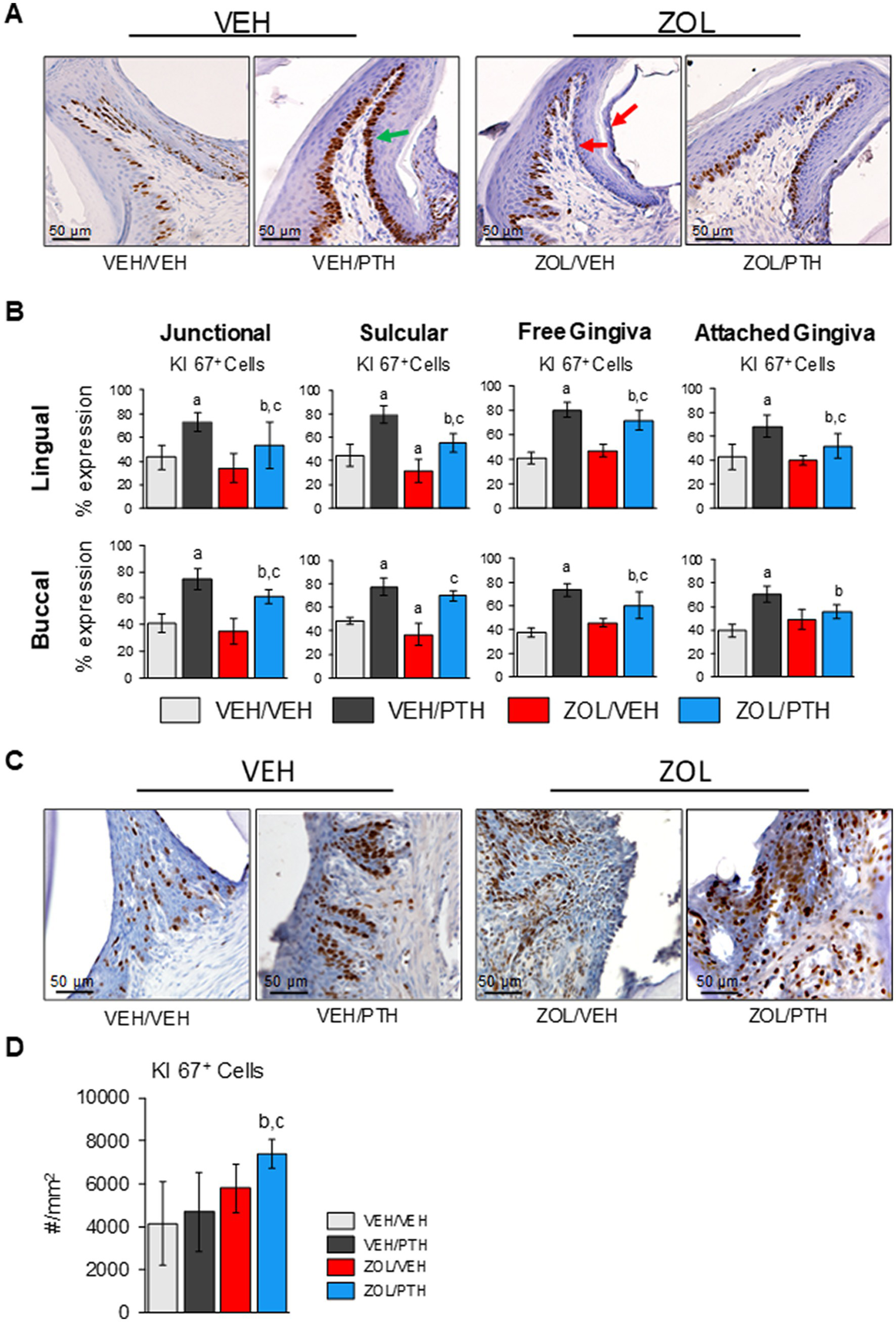 Effects of ZOL and iPTH on regenerative capacity on the gingival epithelium of the mandible (non-lesion area) and maxilla (lesion area). (A) Representative photomicrographs of brown stained Ki67+ cells in the gingival epithelium of the M1 region of the mandible. The green arrows show high proliferation. Red arrows indicate the low proliferation of the basal cells. (B) The percentage of proliferating cells was evaluated at four different regions, including junctional, sulcular, free gingiva, and attached oral epithelium on the lingual and buccal surfaces. Superscripts a–c denote significant differences from VEH/VEH, VEH/PTH, and ZOL/VEH, respectively. (C) Representative photomicrographs of brown stained Ki 67+ cells in the gingival epithelium surrounding the lesion area. (D) The number of proliferating cells per tissue area was evaluated at the lingual aspect of the maxillary M2M3 interdental lesion’s gingiva.