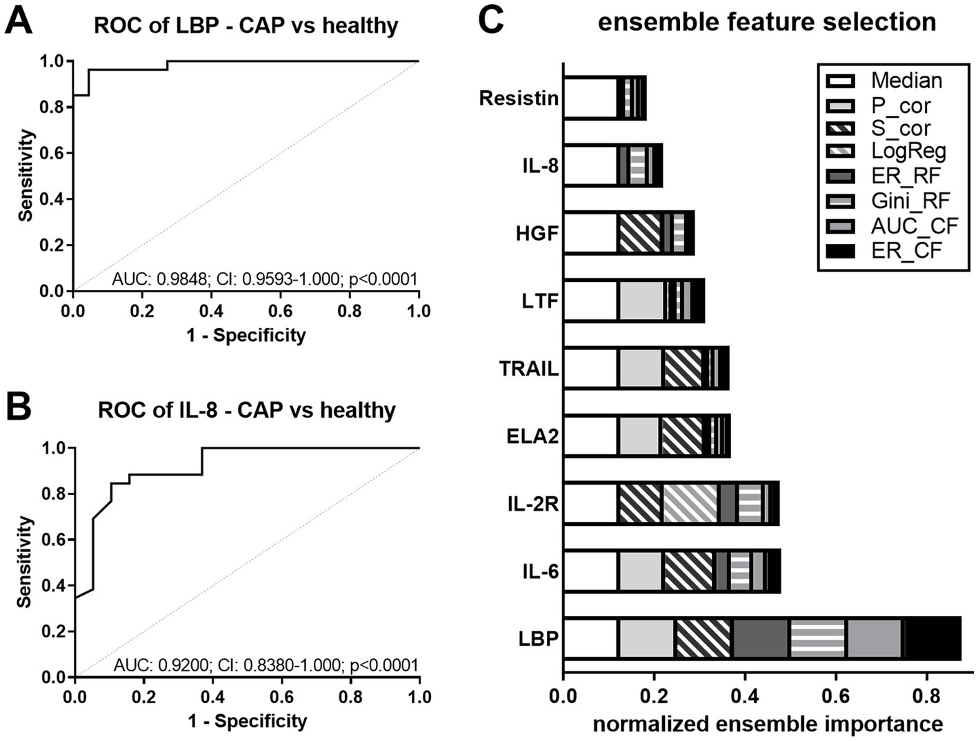 Figure 2. Discrimination between CAP and healthy controls. (A,B) ROC curves for the discrimination between healthy controls and CAP using LBP (A) and IL-8 (B). Dashed line (grey) shows line of identity. AUC, area under the curve; CI, confidence interval, and p-values are depicted in the graphs. (C) Ensemble feature selection for healthy controls and CAP using all significantly regulated biomarkers. The cumulative barplot shows individual features for all feature selection methods. P_cor, Pearson product moment correlation; S_cor, Spearman’s rank correlation; LogReg, logistic regression; ER_RF, error-rate-based variable importance measure embedded in randomForest; Gini_RF, Gini-index-based variable importance measure embedded in randomForest; AUC_CF, area under the curve embedded in cforest; ER_CF, error-rate-based variable importance measure embedded in cforest.