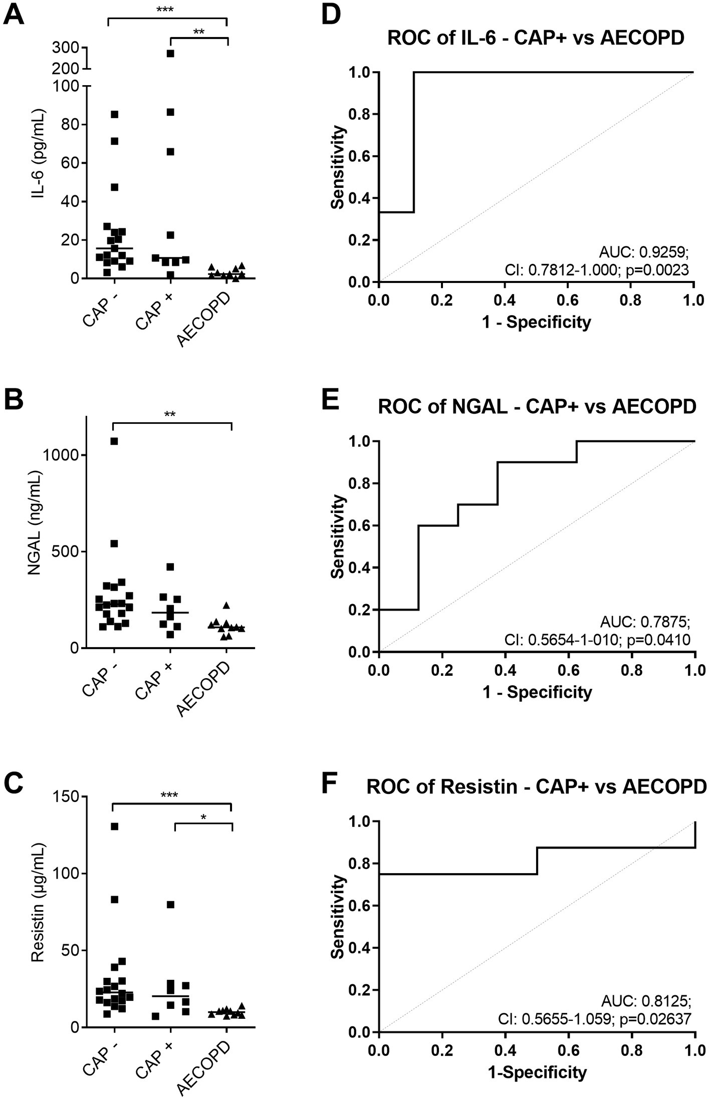 Figure 4. Discrimination between AECOPD and CAP with pre-existing COPD. (A–C) Amount of IL-6 (A), NGAL (B), and resistin (C) in plasma samples from CAP (−/+ COPD) and AECOPD patients. Data are presented as scatter plots and the line shows the median. (D–F) ROC curves for the discrimination between CAP+COPD and AECOPD by IL-6 (D), NGAL (E), and resistin (F). Dashed line (grey) shows line of identity. AUC, area under the curve; CI, confidence interval (CI), and p-value are depicted in the graph. Statistics: Kruskal-Wallis test was performed and p < 0.05 was considered significant (*p < 0.05, **p < 0.01, ***p < 0.001).