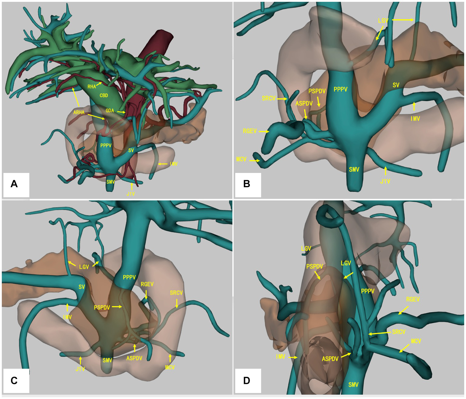 Three-dimensional vascular reconstruction of contrast-enhanced CT scan. The PPPV was located anterior to the pancreas and posterior to the duodenum, and the L-shaped SV was longitudinally located posterior to the pancreatic neck (A). The RHA was located anterior to the CBD, and the ARHA originated from GDA was located posterior to the PV (A). The branches of PV/SMV system were depicted from the anterior (B), posterior (C), and right side (D). PPPV, prepancreatic postduodenal portal vein; SV, spleen vein; SMV, superior mesenteric vein; LGV, left gastric artery; PSPDV, posterior superior pancreaticoduodenal vein; ASPDV, anterior pancreaticoduodenal superior pancreaticoduodenal vein; SRCV, superior right colonic vein; RGEV, right gastroepiploic vein; MCV, middle colon vein; J1V, the first jejunal vein; RHA, right hepatic artery; ARHA, accessory right hepatic artery; GDA, gastroduodenal artery; CBD, common bile duct.