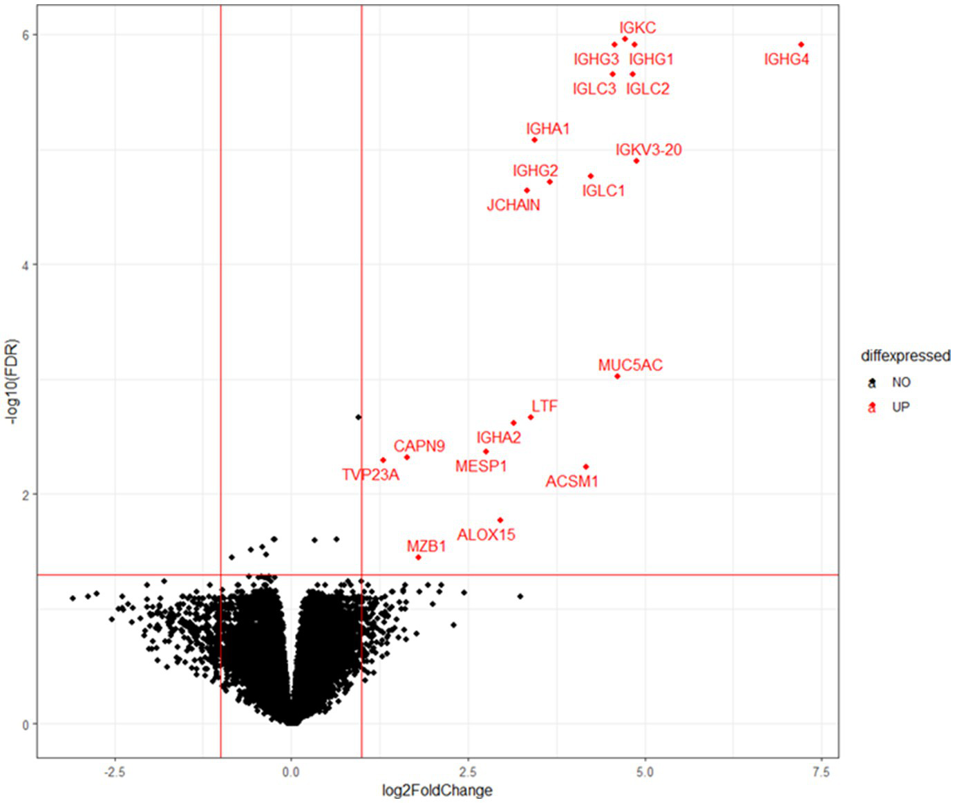 Volcano plot representation of DEGs. X-axis represents log2 values of the fold change of gene expression in the CE group compared to the non-CE group, and the red vertical lines indicate threshold values of log2-transformed fold change (<−1 or >1) for DEG selection. Y-axis represents the –log10 value of FDR q value, and the red horizontal line indicates the threshold value (FDR < 0.05). Twenty genes selected as DEGs are shown by red dots.