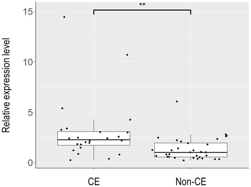Box plot representation of the relative expression levels of TVP23A in endometrial tissues. Endometrial tissues of 33 non-CE cases and 24 CE cases were subjected to quantitative reverse-transcription PCR to assess the relative expression levels of TVP23A. After excluding one non-CE sample that showed extremely poor PCR amplification for ACTB, 32 non-CE cases and 24 CE cases were subjected to the calculation of the relative expression levels of TVP23A and the subsequent Mann–Whitney U test. The expression level of TVP23A was statistically significantly higher in the CE group than in non-CE group (**p = 0.0014).