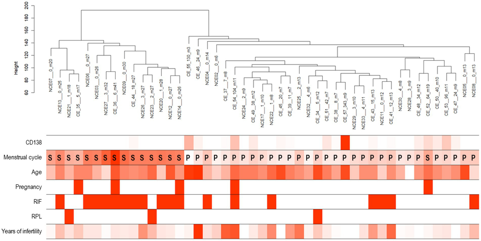 (Top) A dendrogram generated by the hierarchical clustering of CE and non-CE samples with a cut-off threshold of 170 (height). (Bottom) Seven clinical features. Color intensity of each row is proportional to the followings: number of CD138-positive cells, days after the last menstrual period, age, times of past pregnancies, presence or absence of recurrent implantation failure (RIF), presence or absence of recurrent pregnancy loss (RPL), and infertility years.