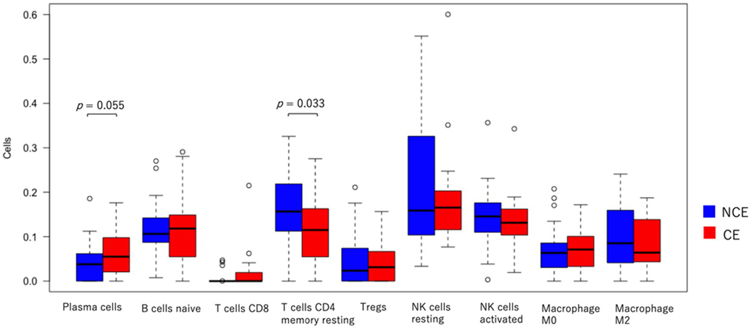 We assessed whether any immune cells other than plasma cells increased their residential cell number in the endometrium of CE patients compared to that in non-CE patients. CIBERSORTx is an analytical tool for imputing gene expression profiles, and it provides an estimation of the abundance of member cell types in a mixed cell population using gene expression data. It uses 547 immune cell-related gene expression values to estimate the abundance of 22 types of immune cells in the sample of interest (28). By subjecting our transcriptome data of CE and non-CE endometria to CIBERSORTx, we were able to estimate the abundance of nine types of immune cells in CE and non-CE samples (Supplementary Table S3). Consistent with the diagnosis of CE using the plasma cell marker CD138, plasma cells tended to be more abundant in the CE samples than in the non-CE samples, although the t-test value of p (0.055) did not reach a statistically significant threshold (0.05) (Figure 7). However, CD4 memory T cells (resting) were less abundant in the CE samples than in the non-CE samples with statistical significance (p = 0.033) (Figure 7).