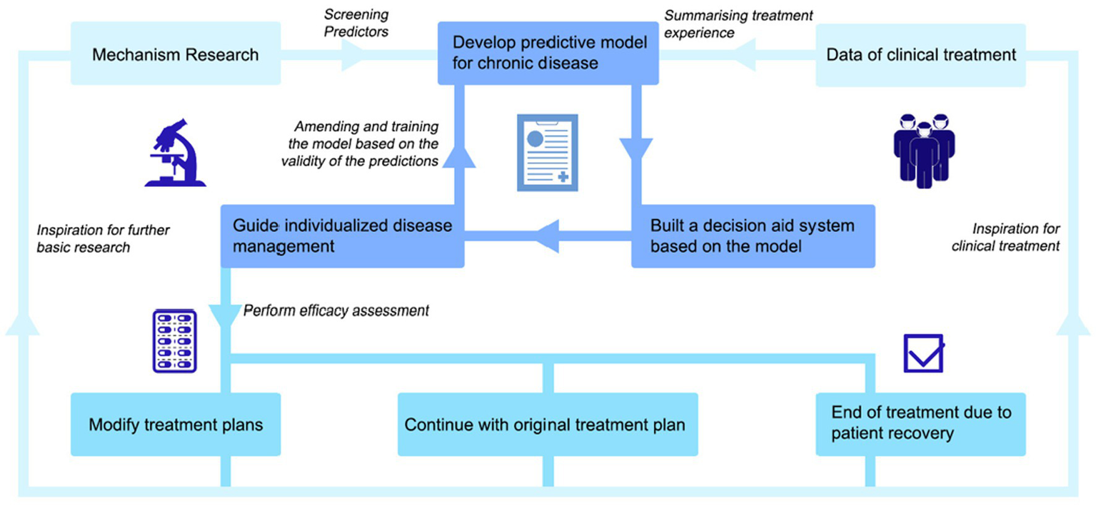 The original intention of our prediction model was to establish a convenient and individualized medical method to guide clinical diagnosis and treatment. Therefore, we innovatively propose a closed-loop prediction model for IBDs patients who use the “negative feedback” mechanism to continuously revise and train the model. Not limited to IBDs but for all non-infectious chronic diseases. Chronic diseases have a long diagnosis and treatment time, many accumulated organs, frequent complications, easy recurrence, and lack of specificity. These facts require clinicians to strengthen their comprehensive understanding of them in the practice process and to attempt to achieve early detection, early diagnosis, and early treatment. After developing an effective predictive model based on reliable predictors, we not only can predict the patient’s disease outcome and development based on the predictive model but also can achieve early diagnosis and early treatment. It is also possible to conduct individualized disease management and interventions according to the predicted results and use reliable treatment methods, such as drugs and surgery, to intervene in the disease to evaluate the effectiveness of the treatment plan according to whether the intervention results are effective and to what extent or to terminate or revise the treatment plan over time. Negative feedback can act on the original prediction model to realize the revision and training of the model. Therefore, we believe that this closed-loop prediction model will guide the individualized medical treatment of patients, which can realize scientific long-term medication, precise disease management, and individualized medical treatment, effectively prolonging the remission period and reducing morbidity and disability rates. We expect that the coexistence of chronic disease patients and diseases can be realized with this model, thereby achieving a new height of chronic disease management and providing substantial value for its rapid diagnosis and adequate treatment.