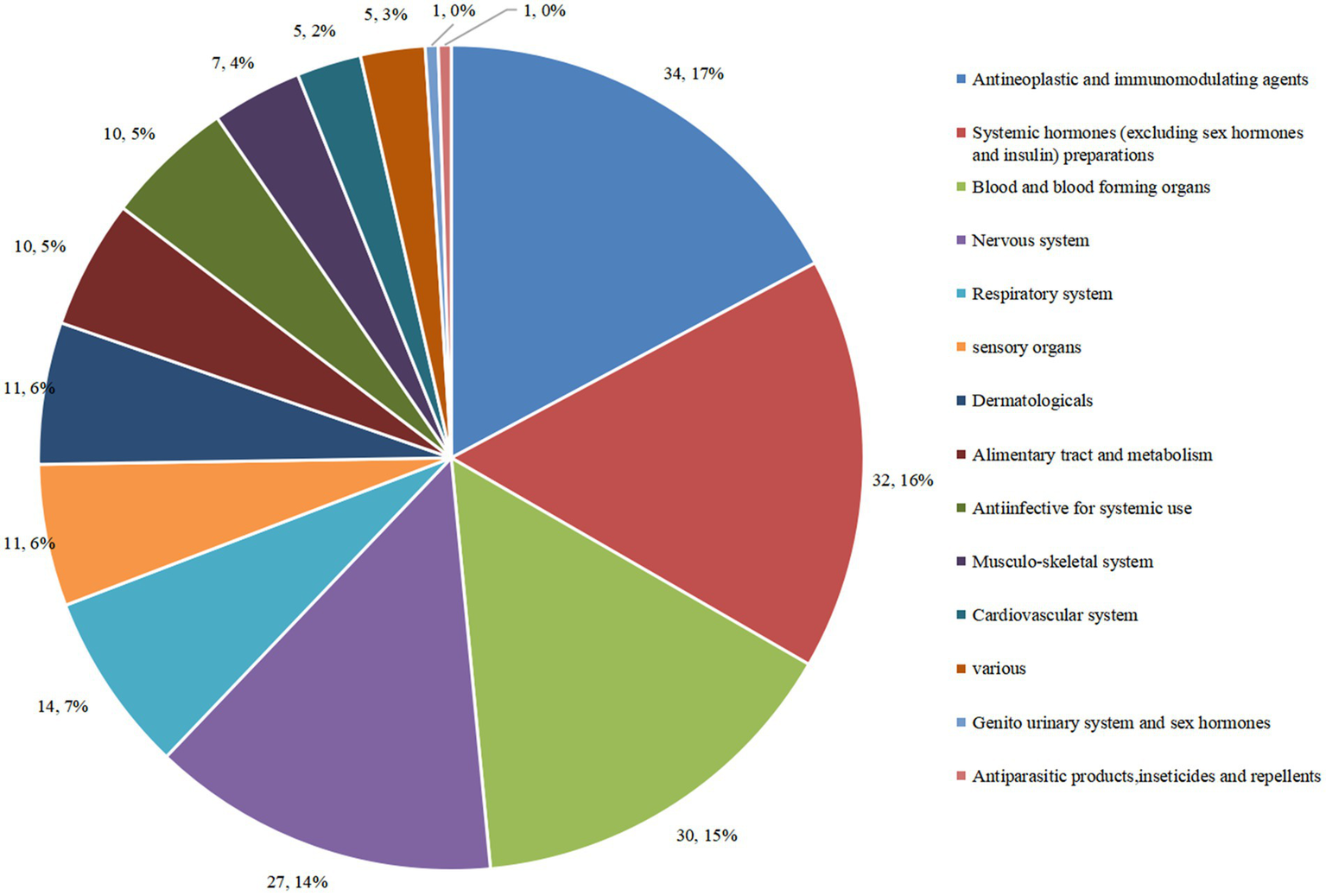Distribution of clinical trials corresponding to different ATC classes of pediatric innovative drugs in China.
