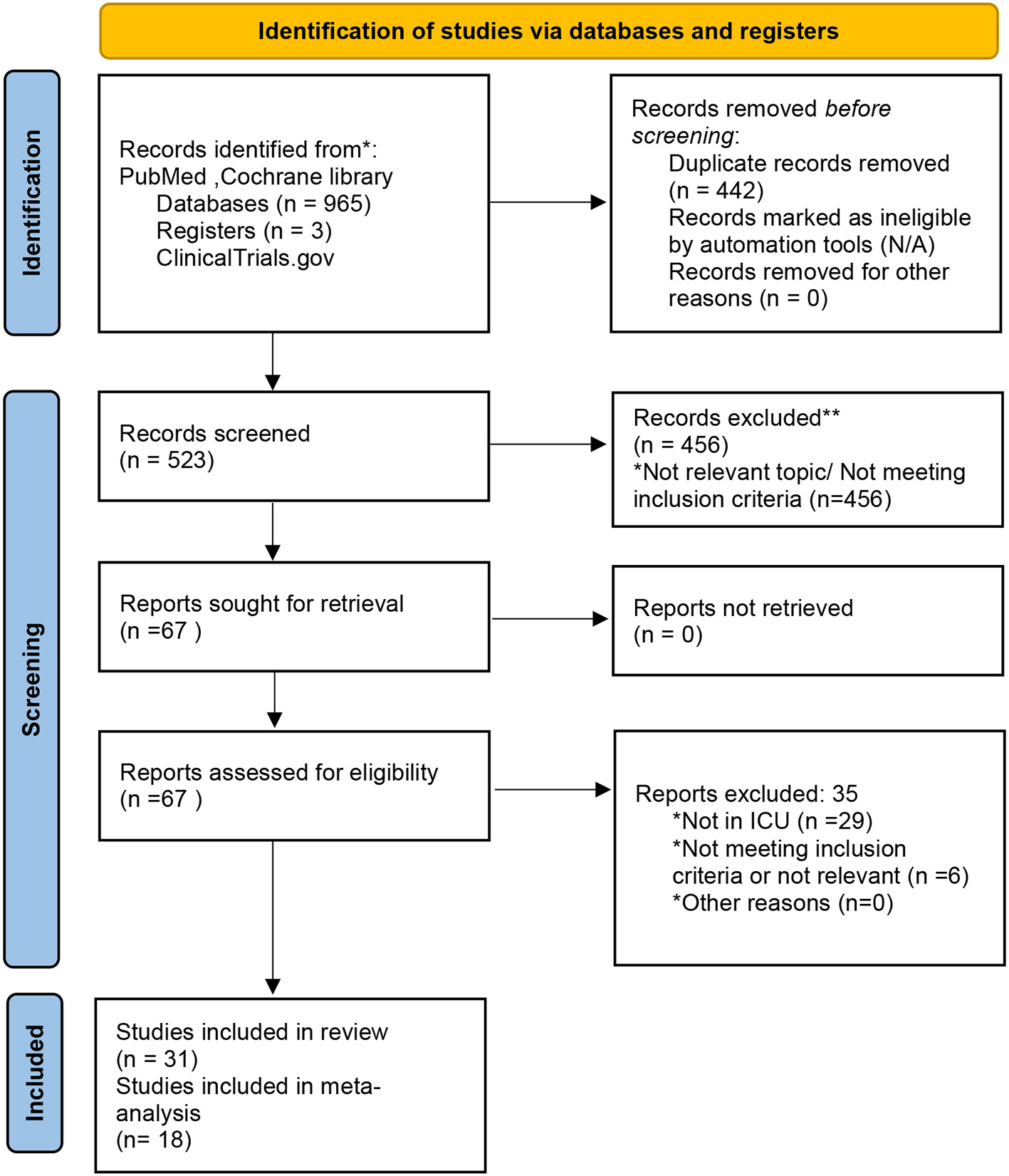 An electronic database search on publications without time or study type search restrictions revealed a total of 965 publications. After removing duplications, a total of 523 publications remained. After the screening of titles and abstracts, there were 456 articles that did not meet the inclusion criteria or were not related to this topic, and 29 articles that were not inclusive of an ICU setting. Finally, a total of 31 articles were analyzed and synthesized for a systematic review, and 18 studies were included in the meta-analysis (Figure 1).