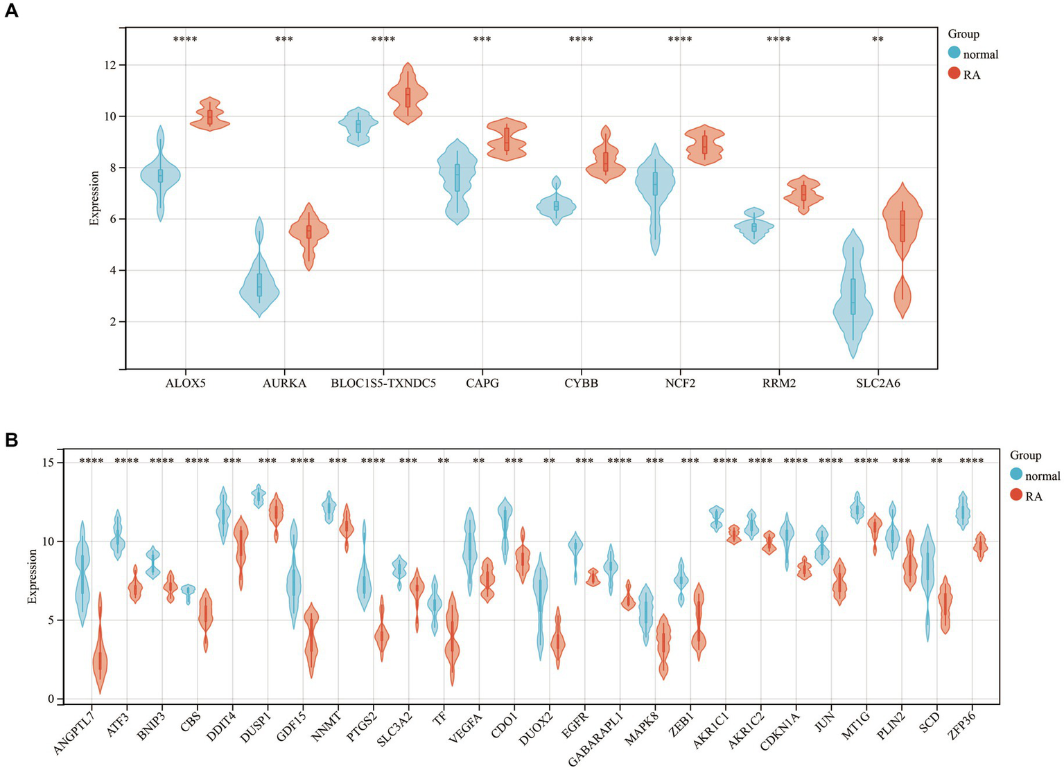 The violin diagram of 34 DEFGs between the patients with rheumatoid arthritis and healthy individuals. (A) 8 upregulated genes (B) 26 downregulated genes. **: p-value < 0.01, ***: p-value < 0.001, ****: p-value < 0.0001.