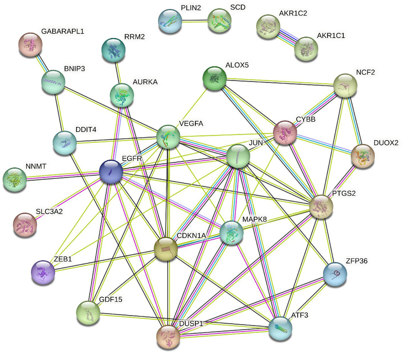 Furthermore, we generated a violin diagram to illustrate the expression patterns of the 34 DEFGs (Figure 2). There are 8 upregulated genes (Figure 2A) including SLC2A6, ALOX5, AURKA, CYBB, NCF2, CAPG, RRM2, BLOC1S5-TCNDC5, and 26 downregulated genes (Figure 2B) included ANGPTL7, ATF3, BNIP3, CBS, DDIT4, DUSP1, GDF15, NNMT, PTGS2, SLC3A2, TF, VEGFA, CDO1, DUOX2, EGFR, GABARPL1, MAPK8, ZEB1, AKR1C2, CDKN1A, JUN, MT1G, PLIN2, SCD, ZFP36.