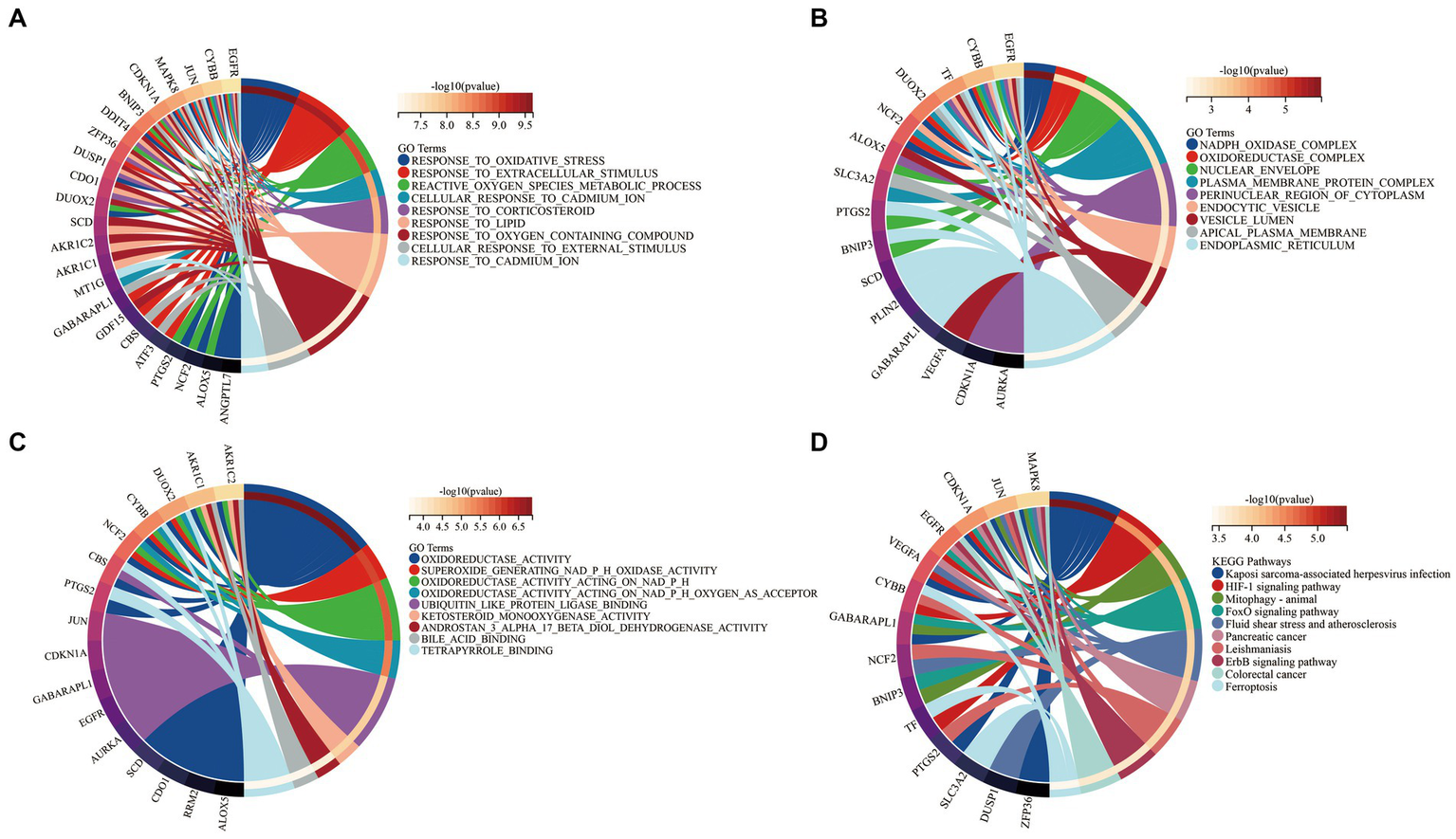 To elucidate the biological functions of the 34 DEFGs, GO and KEGG enrichment analyses were performed using the “clusterprofiler” package to identify significantly enriched terms. The most significantly enriched GO terms of BP were cellular response to oxidative stress, response to extracellular stimulus, and reactive oxygen species metabolic process (Figure 5A). In the CC category, they were involved in nicotinamide adenine dinucleotide phosphate (NADPH) oxidase complex, oxidoreductase complex, and nuclear envelope (Figure 5B). In the MF category, they were involved in oxidoreductase activity, superoxide generating NADPH oxidase activity, and oxidoreductase activity acting on nicotinamide adenine dinucleotide phosphate (NADPH; Figure 5C). KEGG enrichment was mainly distributed in HIF-1 signaling pathway, FoxO signaling pathway, and Ferroptosis pathway (Figure 5D).