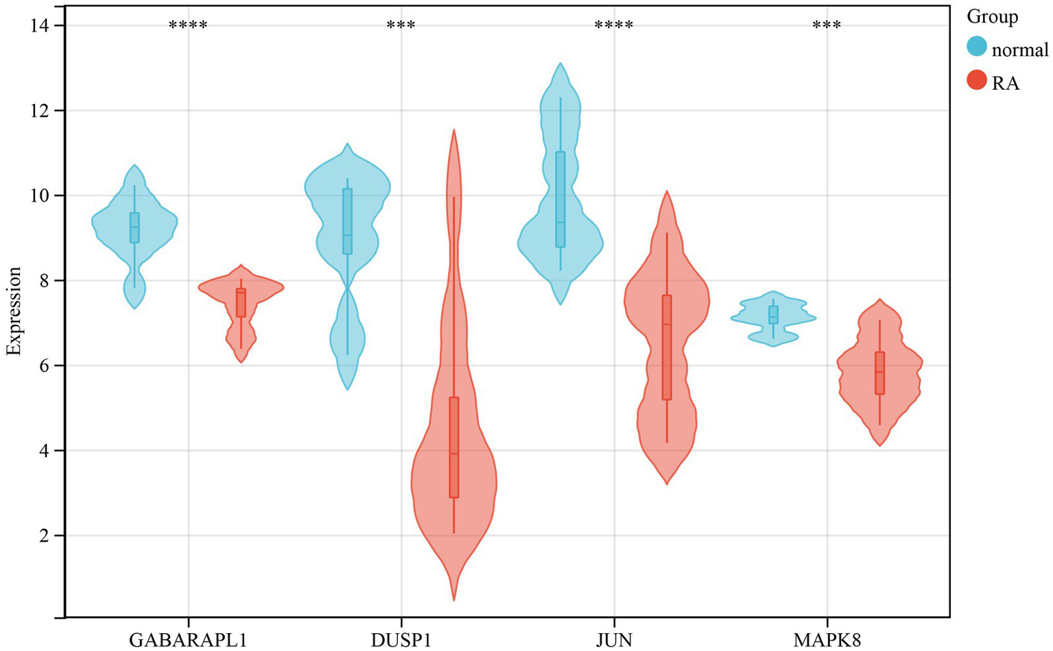 Validation of gene expression in the GSE12021 dataset. The violin diagram showed 4 DEFGs between RA patients and healthy individuals. The Wilcox test was used to compare RA patients with normal samples. ***: p-value < 0.001, ****: p-value < 0.0001.