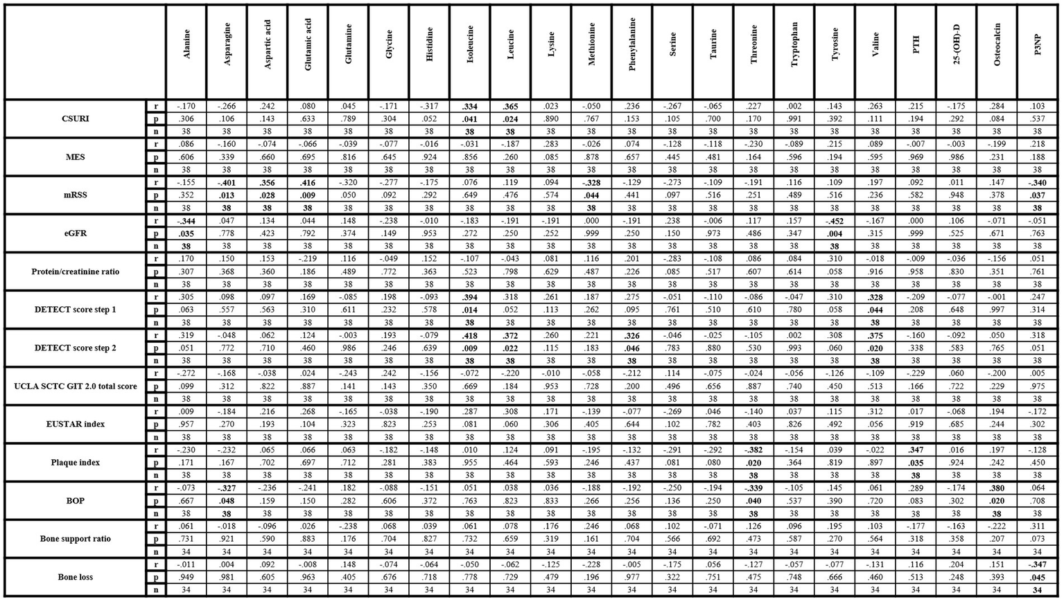 CSURI revealed a significantly positive correlation with isoleucine and leucine while MES did not show any correlation with amino acids. MRSS was significantly positive correlated with aspartic acid and glutamic acid and negatively with asparagine and methionine. Additional significantly negative correlations were observed between eGFR, alanine and tyrosine while protein/creatinine ratio did not correlate with any amino acid. The DETECT score correlated significantly positively with isoleucine, leucine, phenylalanine and valine, but neither the total score of the UCLA SCTC GIT 2.0 questionnaire nor the EUSTAR index revealed a correlation with any amino acid. Significantly negative correlations were found between threonine, plaque index and BOP as well as between BOP and asparagine.